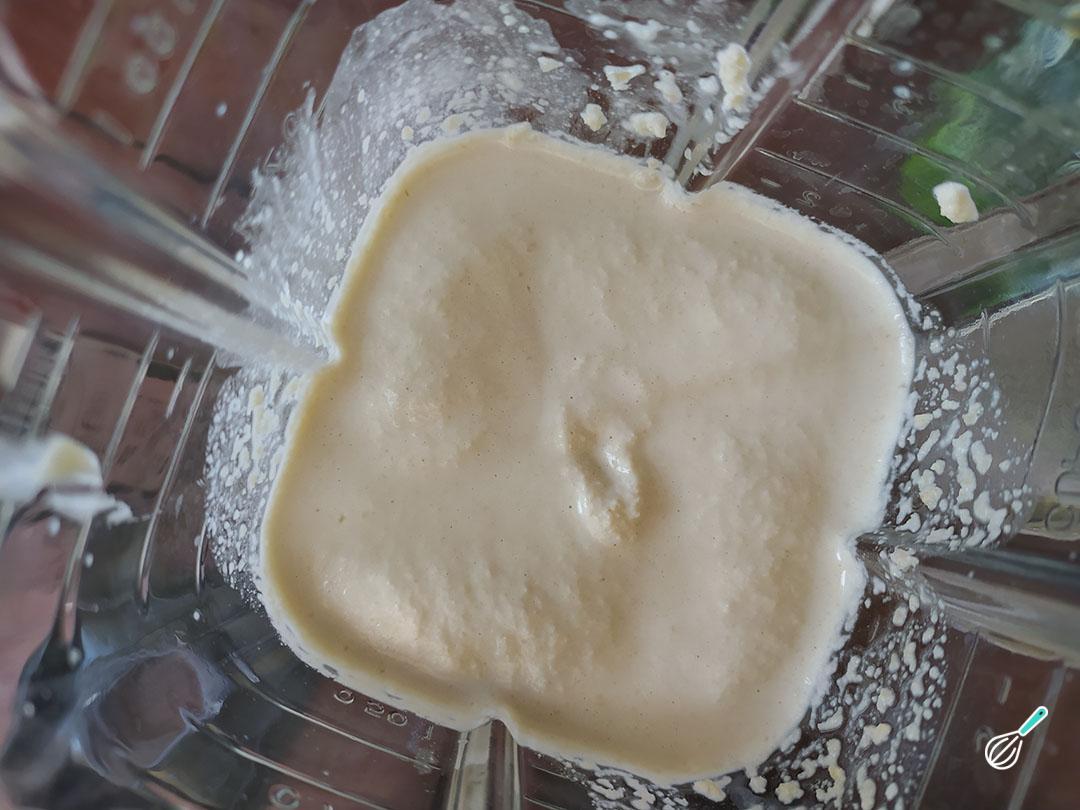 Coloque os amendoins no liquidificador e acrescente a bebida vegetal, o açúcar e a baunilha. Bata até obter um creme macio e o mais lisinho possível. Este creme vegano será o substituto do creme mascarpone usado na receita original de tiramisú!
