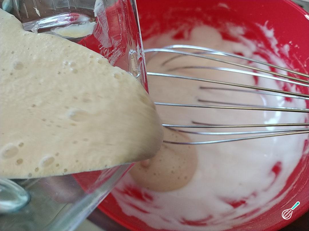 Prepare a aquafaba numa tigela e adicione a mistura do liquidificador. Incorpore com movimentos envolventes, usando um batedor de arame (como na foto), para conseguir um creme leve e areado.