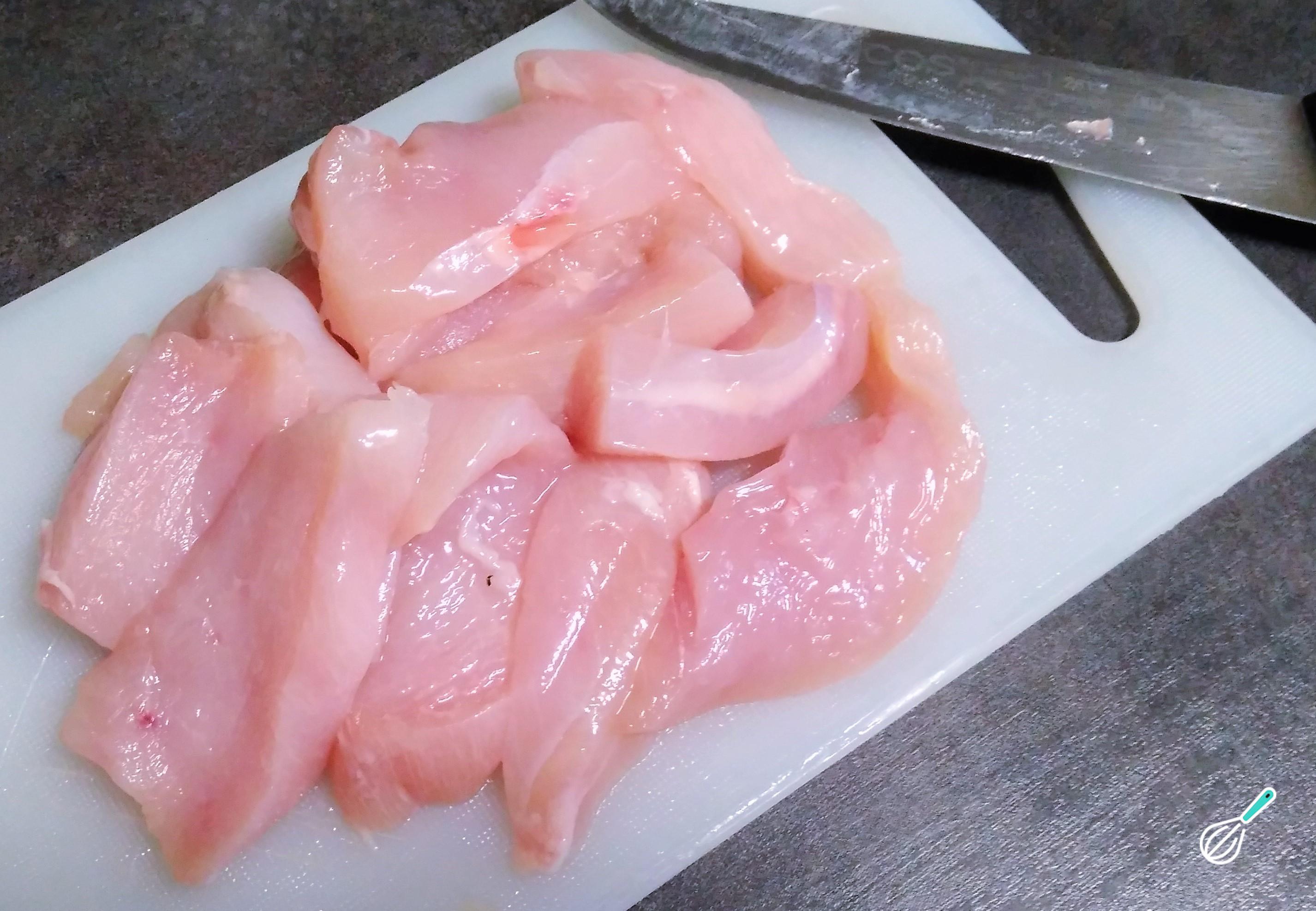 Para preparar as tiras de frango no forno, comece por cortar o peito em tiras. Se preferir, corte o frango em pedaços pequenos, assim você pode comer o frango com as mãos sem problemas!