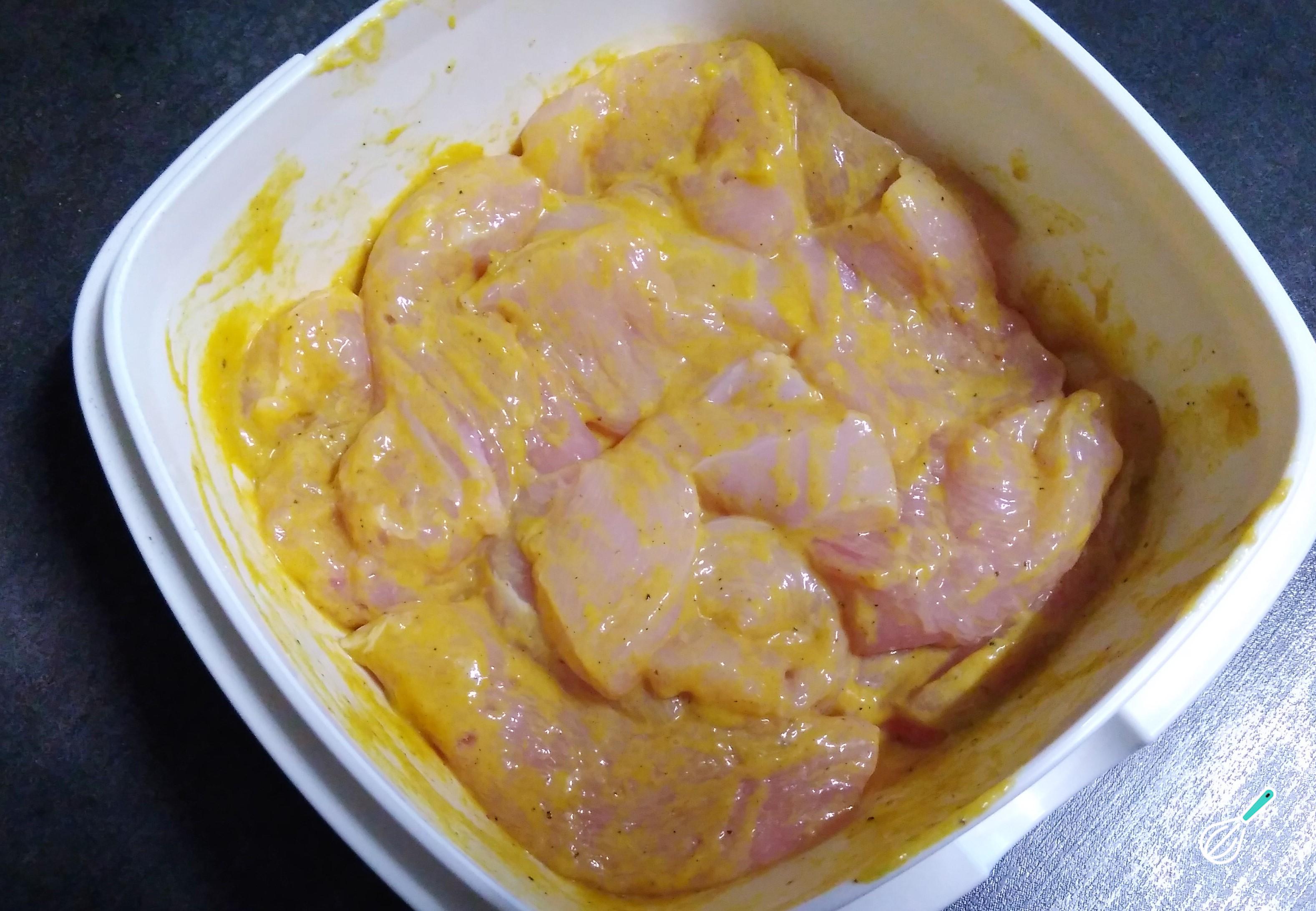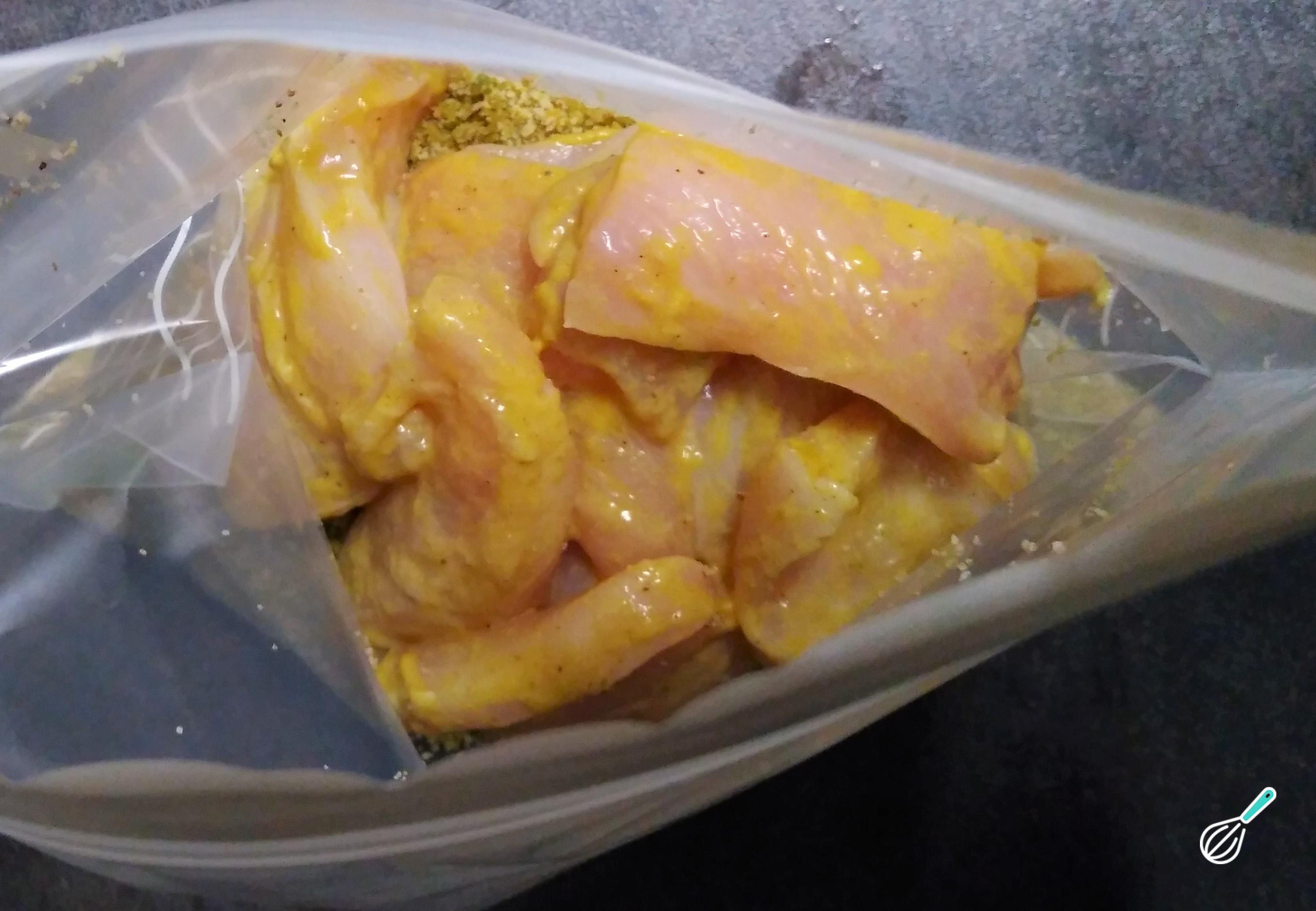 O próximo passo é cobrir o frango com a mistura. O frango estará coberto do líquido da marinada, então a melhor forma de cobri-lo é colocar tudo em um saco com fecho hermético e agitar violentamente. Verá como as tiras de frango ficam perfeitamente cobertas!