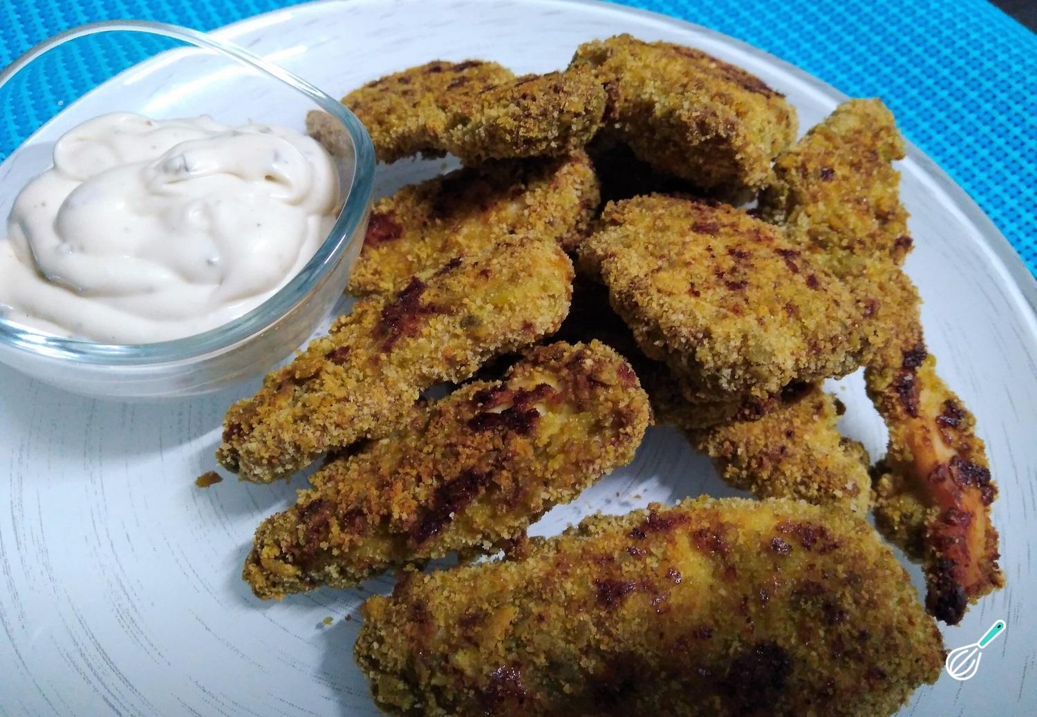 Sirva as tiras de frango no forno com um pouco de molho como maionese caseira ou molho tártaro. Esta preparação é ideal para uma tarde de petiscos com amigos ou para uma festa!