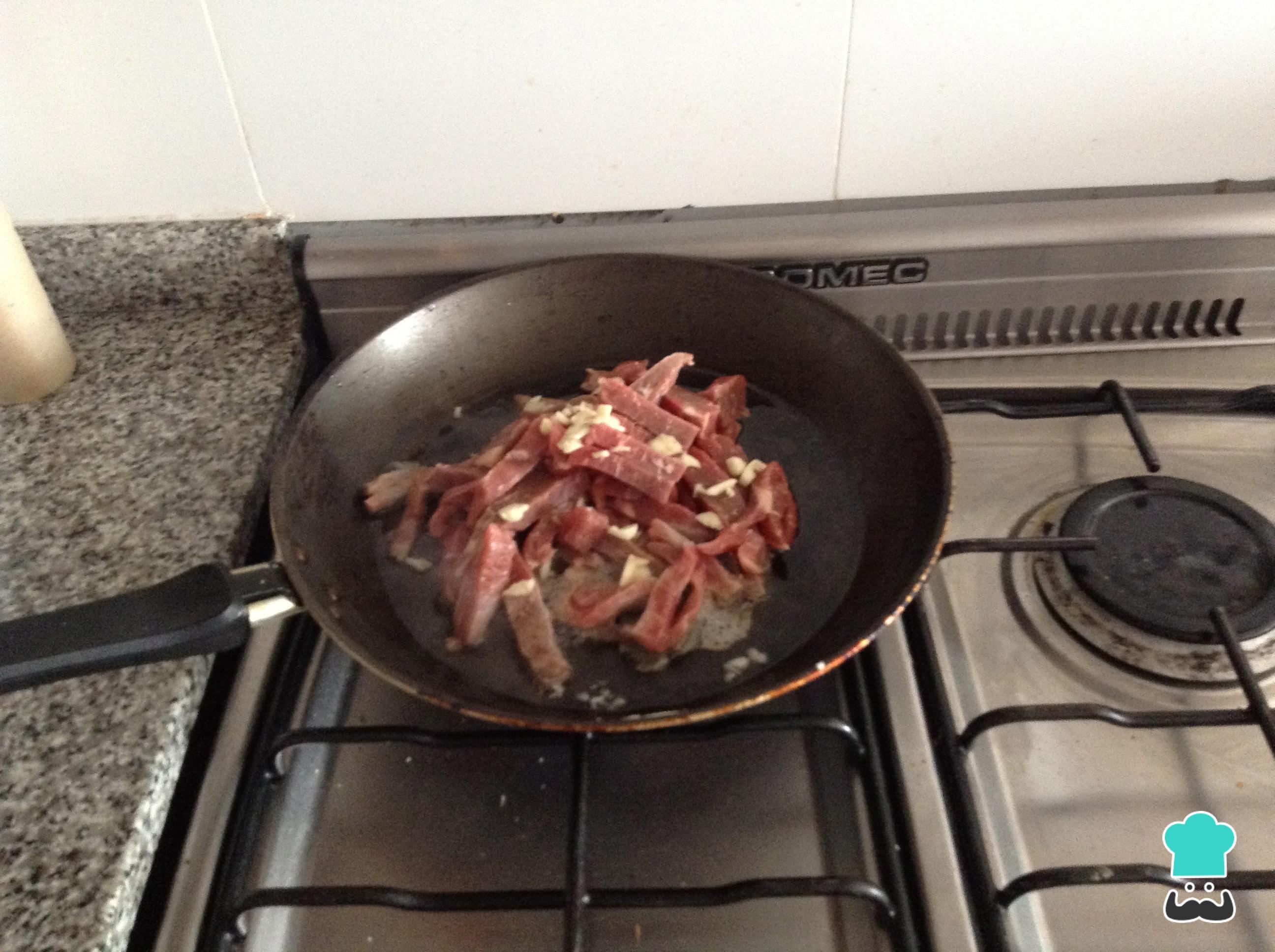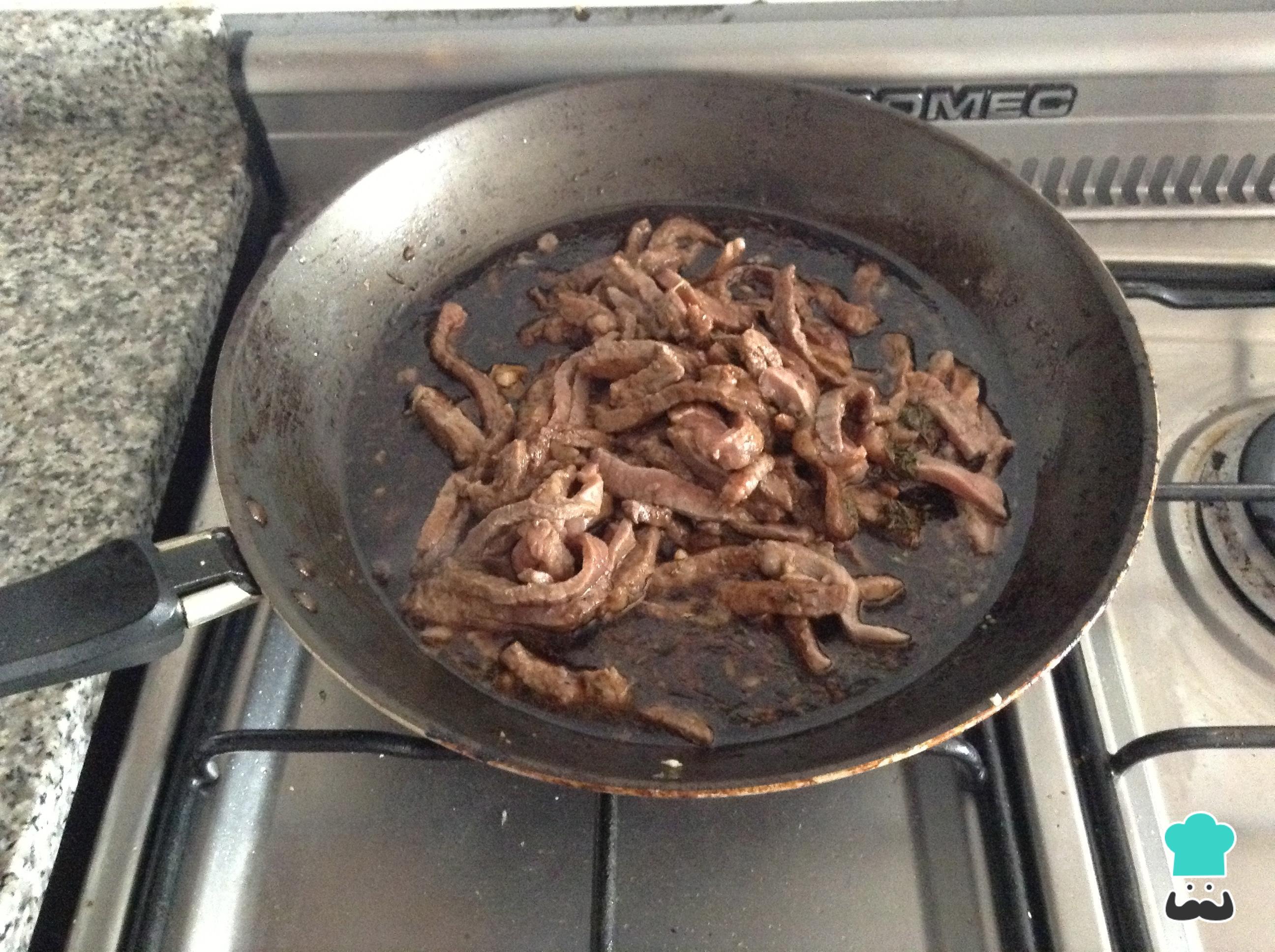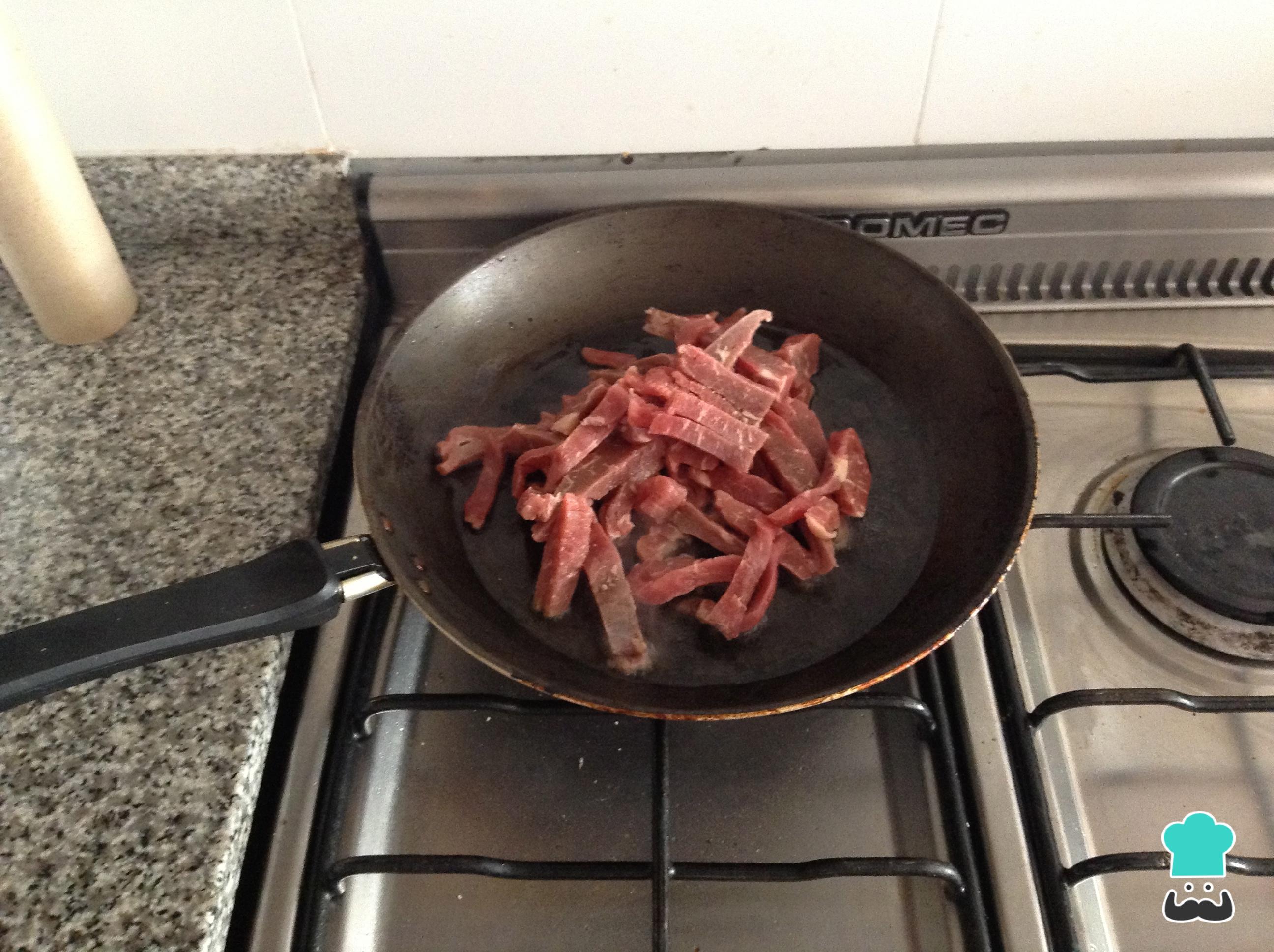Em uma frigideira grande e quente adicione o óleo vegetal e o lombo cortado em tiras. Deixe refogar por alguns minutos.