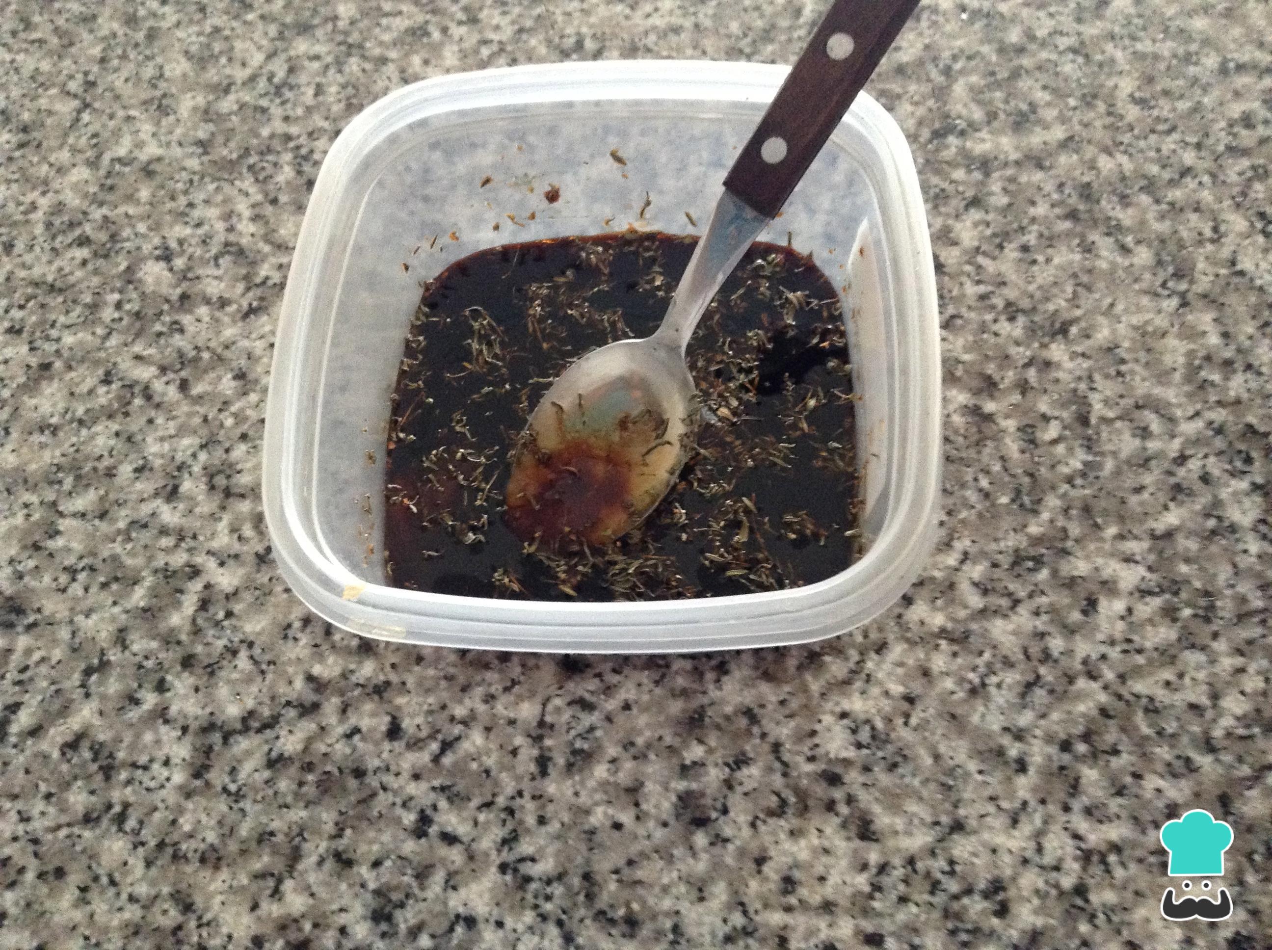 Em uma tigela misture o mel, o molho de soja e o tomilho.
