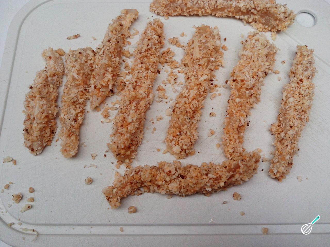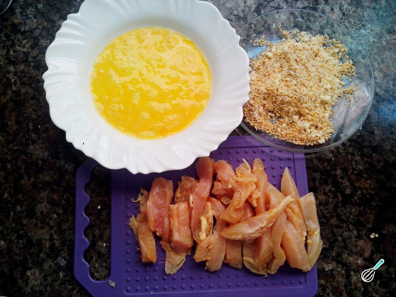 Agora só empanar, passando as tiras de frango no ovo e depois na mistura de amendoim e queijo.