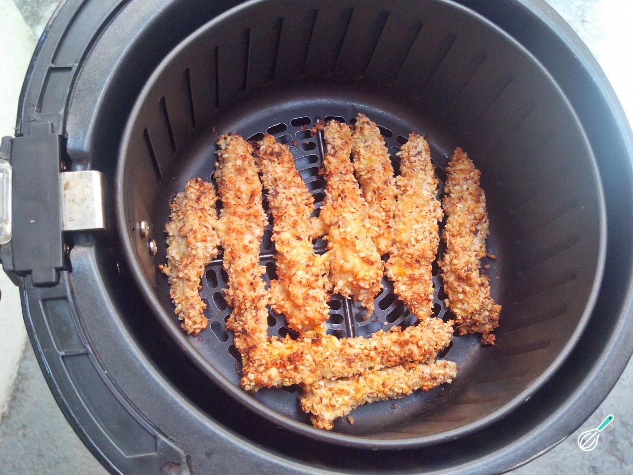 Estão prontas suas tirinhas de frango empanadas e assadas! Pode servir simples assim ou acompanhadas de um molho baixo em calorias, como o vinagrete de mostarda caseiro.