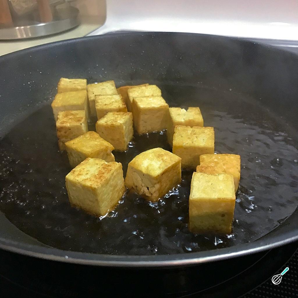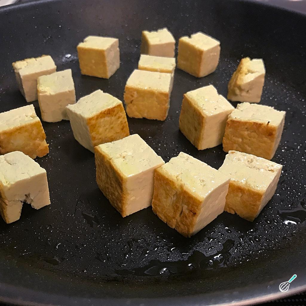 Em seguida corte o tofu em cubos e coloque sobre uma frigideira com óleo de coco. Frite até que fique dourado de todos os lados.
