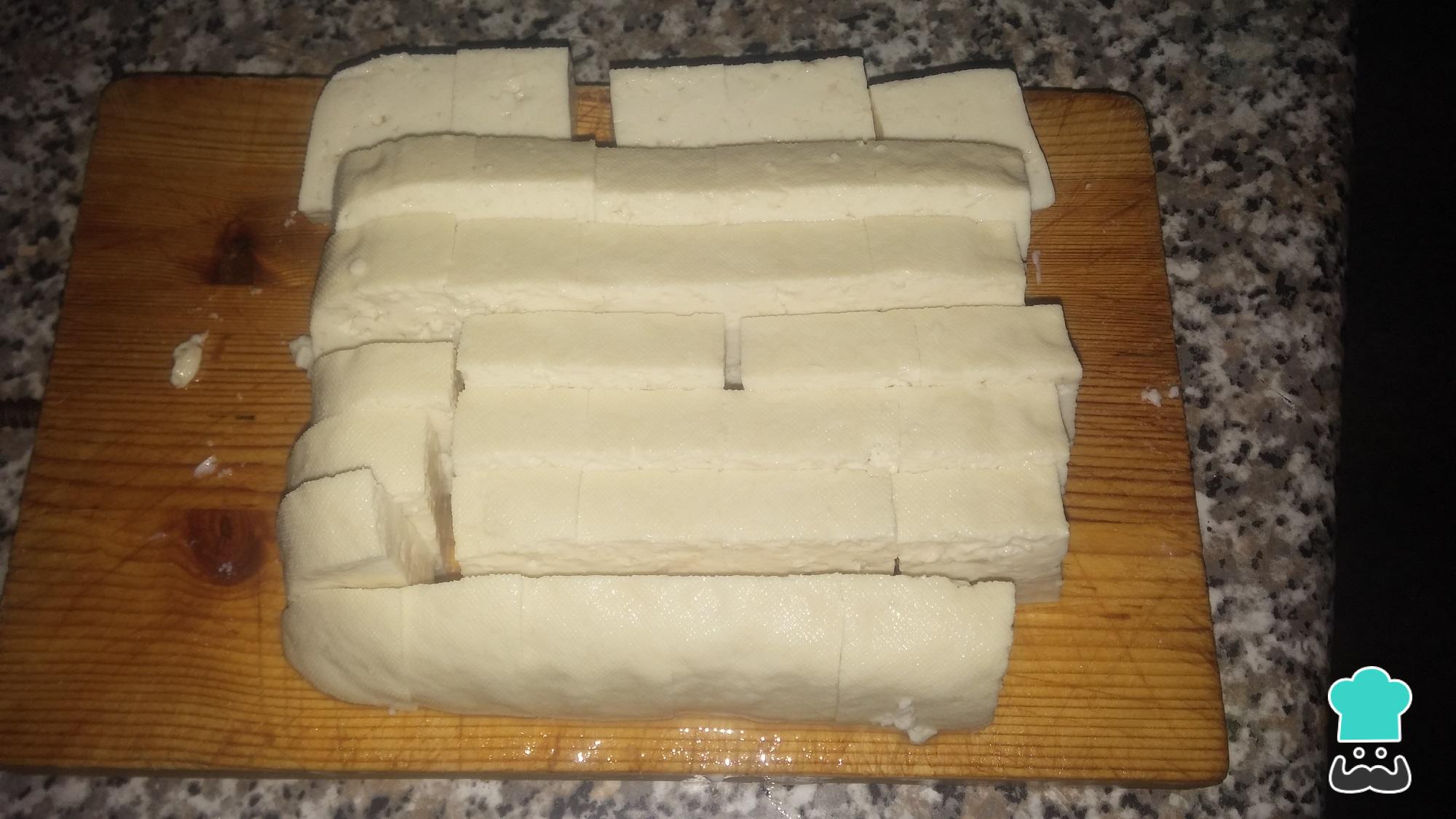 Para preparar esta receita de tofu saboroso, o primeiro passo é cortar o tofu em tiras ou fatias, mais ou menos com a espessura de um dedo.