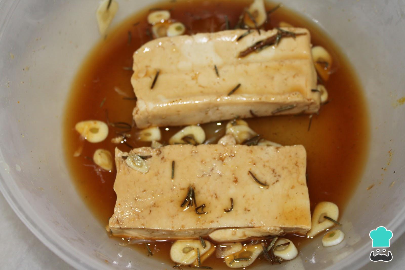 Misture os restantes ingredientes em uma tigela e coloque aí o tofu, de modo a que todas as tiras estejam em contato com a marinada. Reserve por 30 minutos na geladeira, virando de vez em quando.