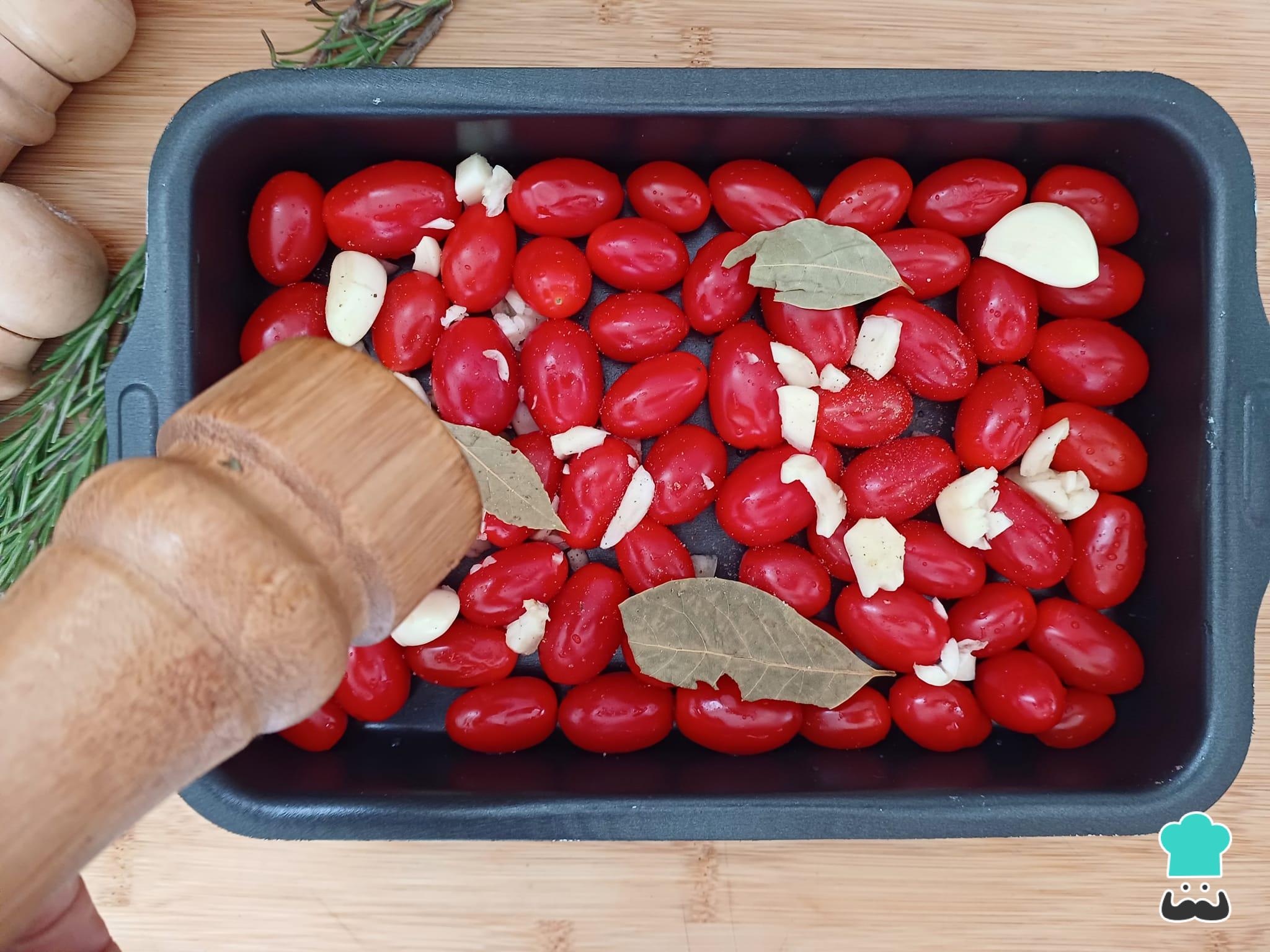 Num refratário pequeno, acomode os tomatinhos, distribua as folhas de louro e o alho picado.