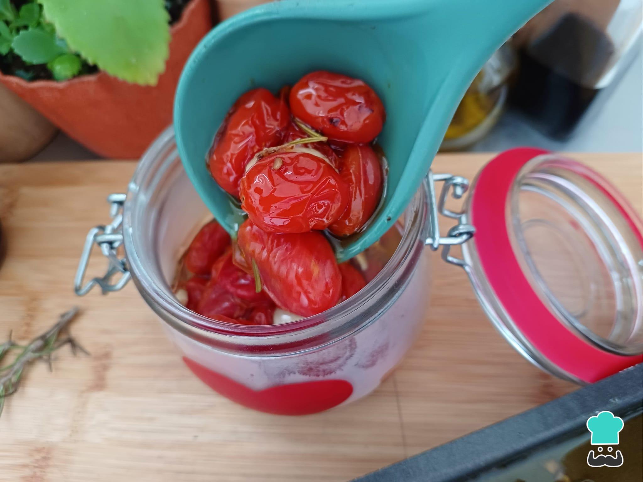 Transfira o tomate confitado ainda quente para um pote de vidro esterilizado.