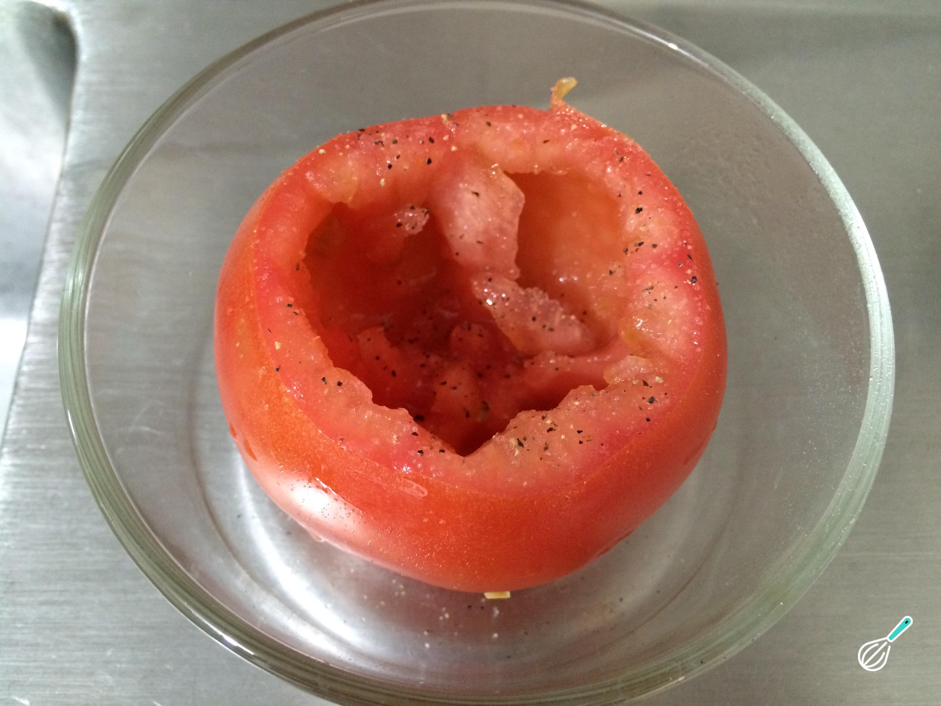 Para fazer tomate recheado com bacon, comece por remover "a tampa" do tomate e o seu miolo, sem danificar a fruta. Tempere por dentro com sal.