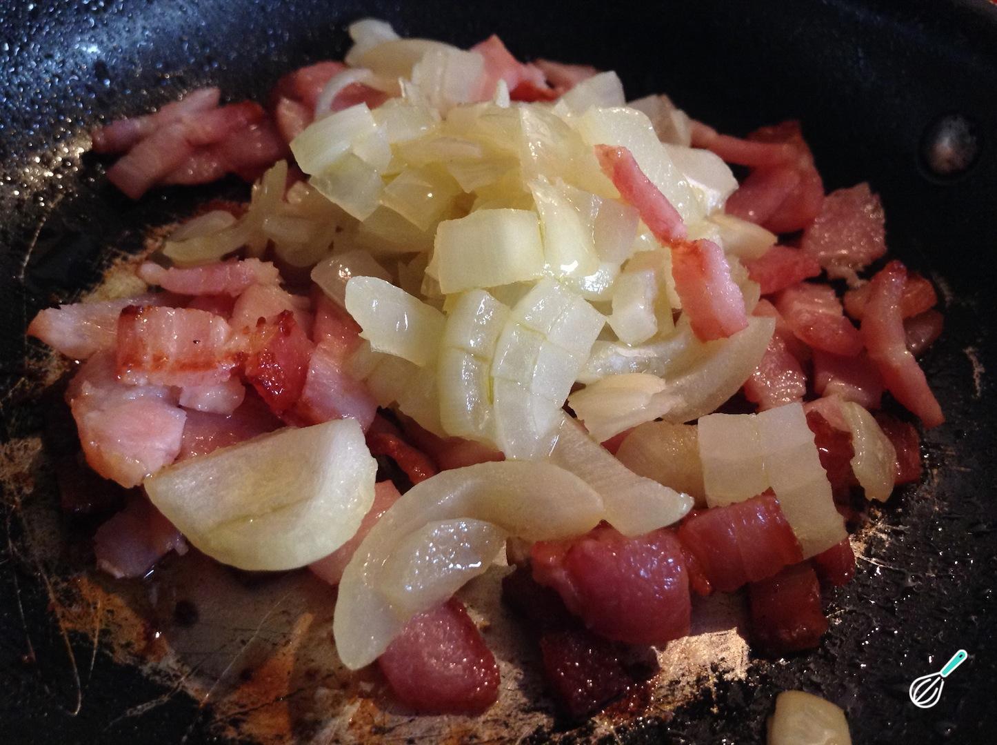Em uma panela, aqueça um fio de azeite. Frite o bacon e adicione a cebola, a salsinha e o pão picado. Tempere com pimenta do reino e deixe refogar.