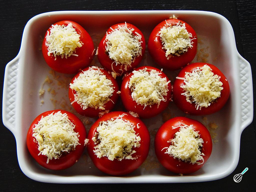 Em seguida, recheie os tomates, deixando que o recheio cubra o tomate. Coloque o parmesão por cima e leve ao forno por 30 minutos.