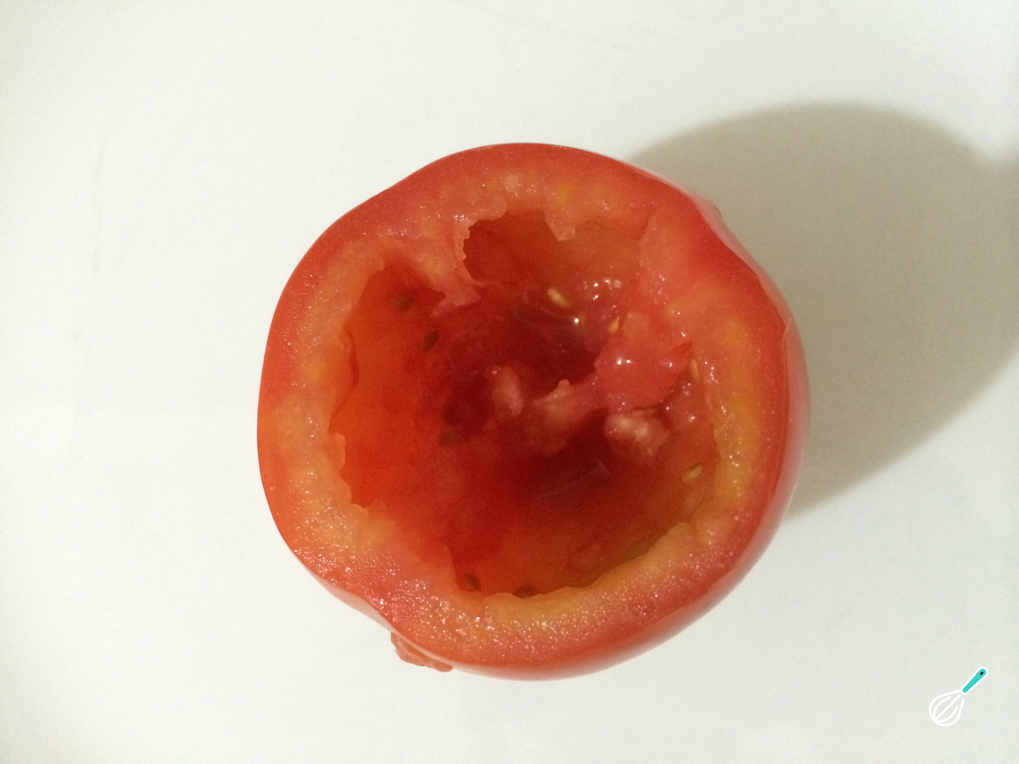 Em seguida, recheie os tomates com a mistura do passo anterior, usando uma colher e deixando o tomate bem compactado.