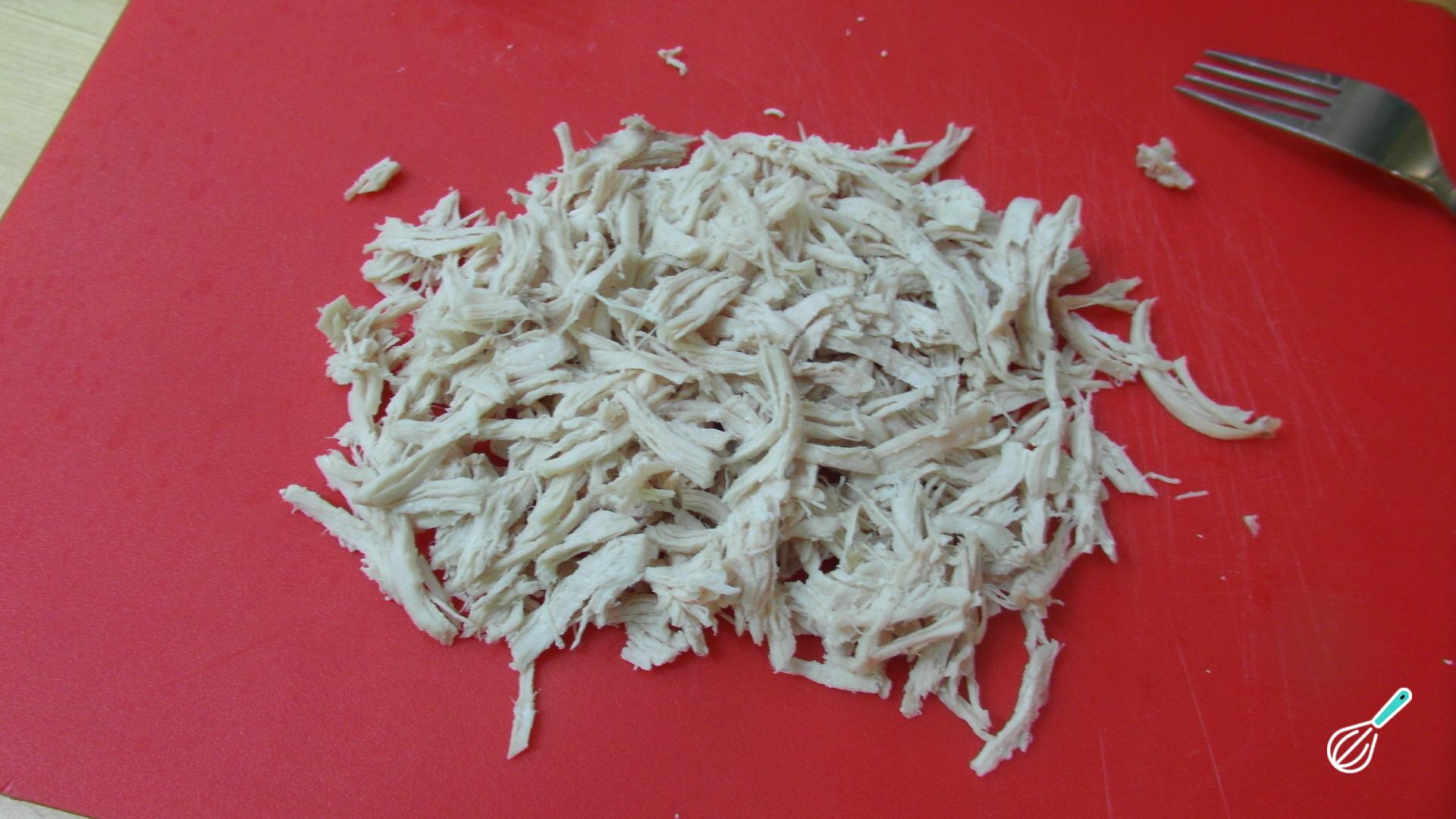 Dica: Para preparar o frango, basta cozê-lo em uma panela com água fervente até ficar macio.