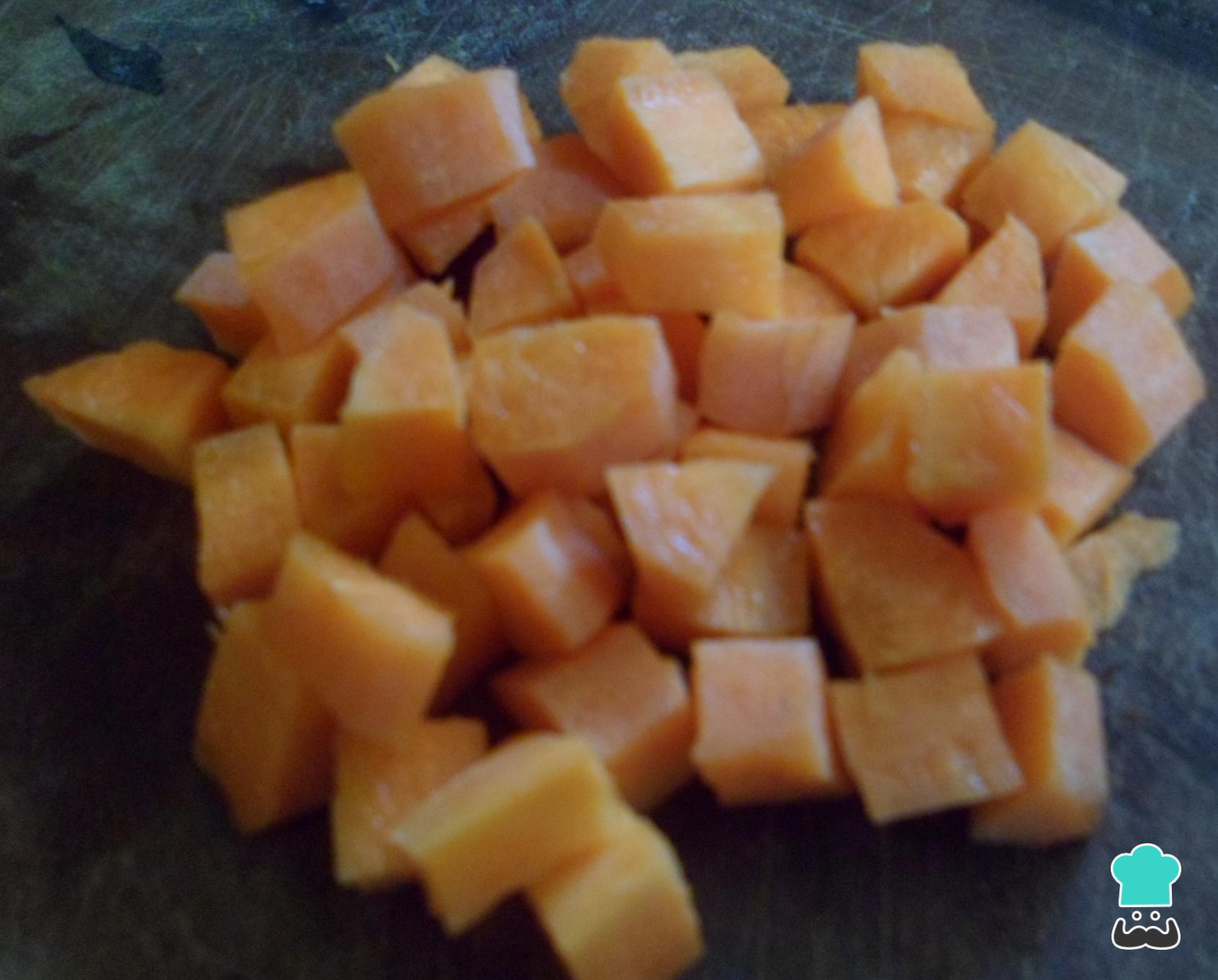 Descasque a cenoura e corte em cubos pequenos.