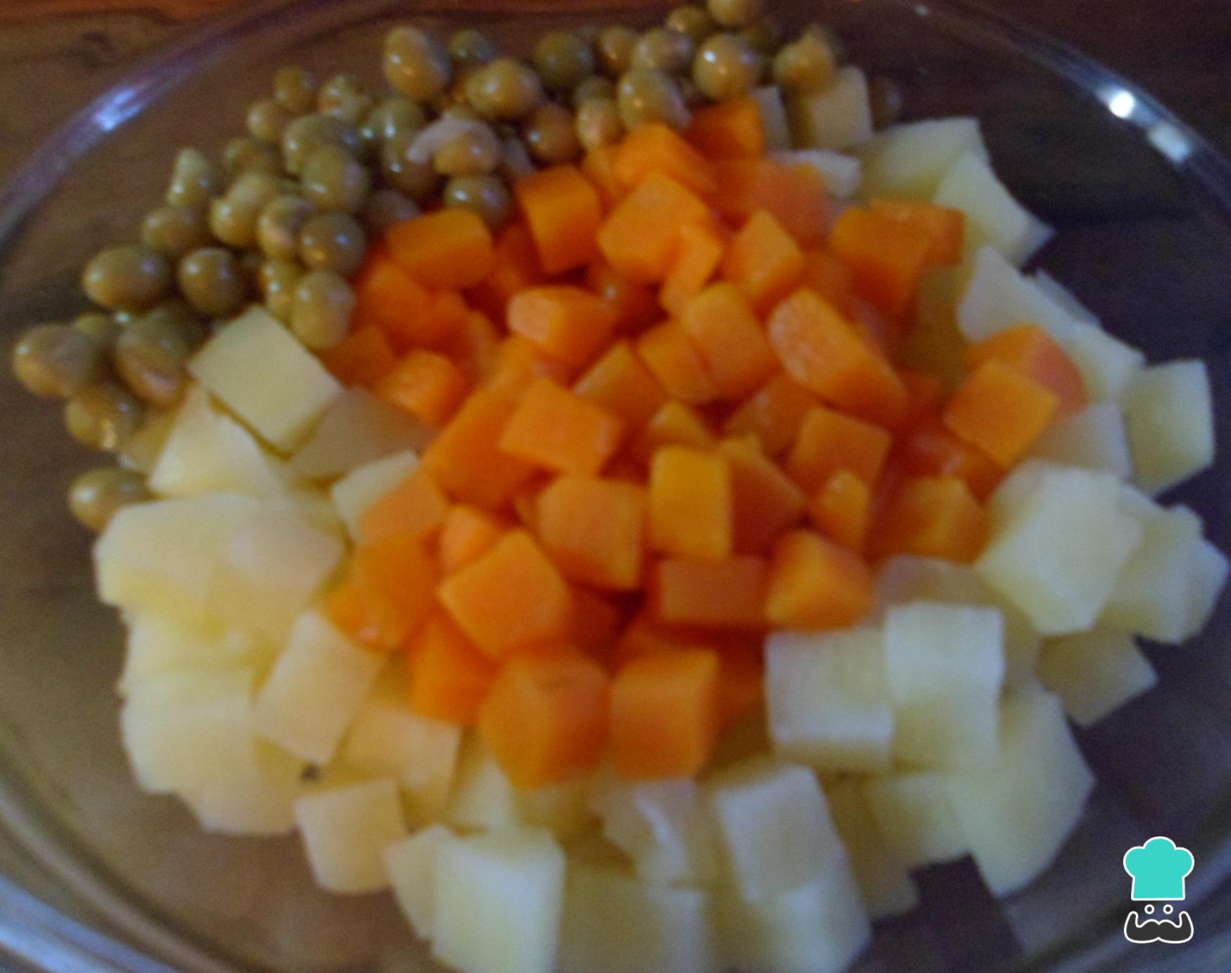 Quando os legumes estiverem cozidos, escorra e coloque em uma tigela junto com as ervilhas. Deixe esfriar ou amornar.