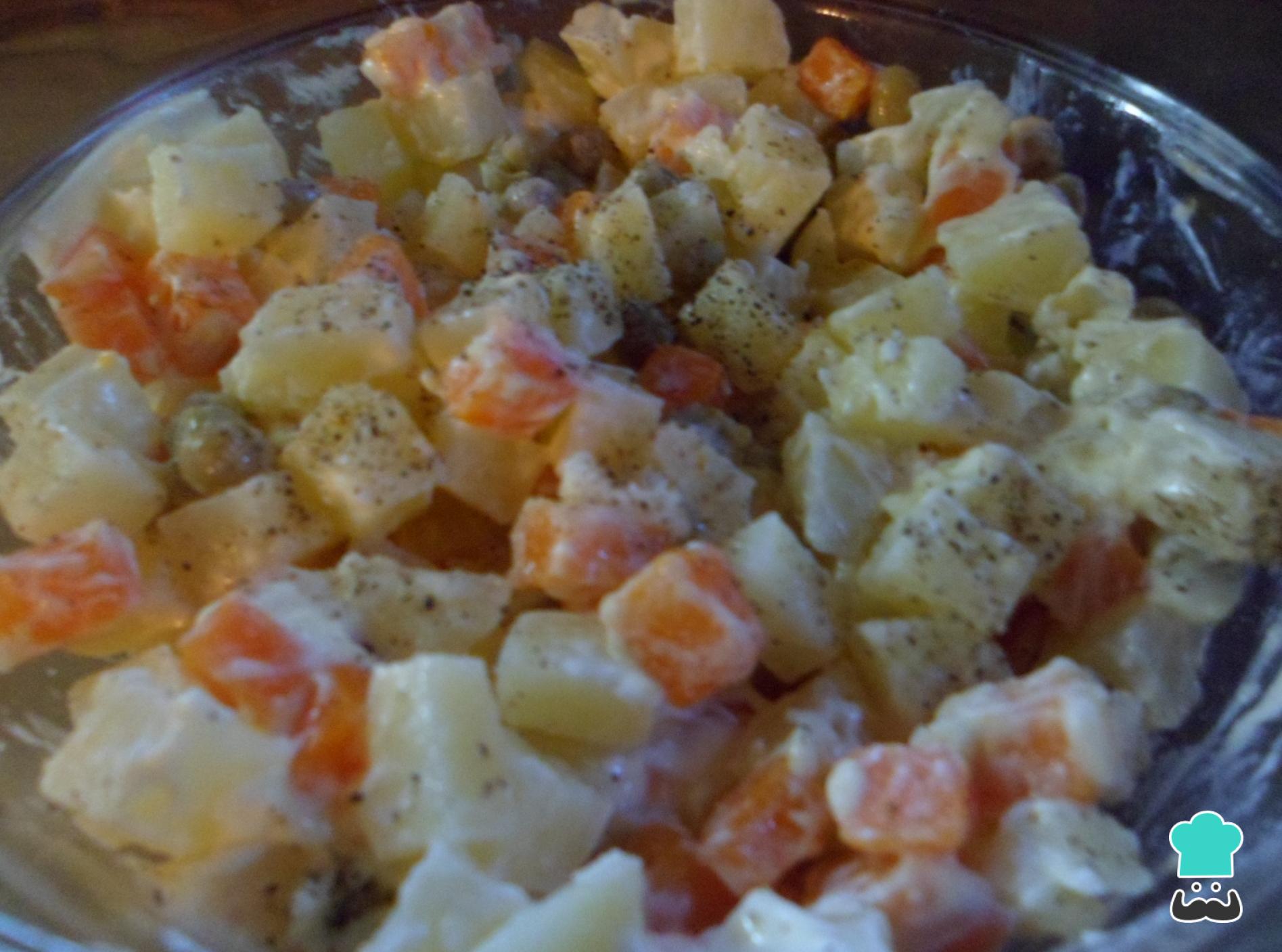 A seguir, descasque e corte as batatas em cubos também. Tenha em conta que, para esta receita detomates recheados, é necessário cortar as cenouras e as batatas mais pequenas do que para a salada russa tradicional.