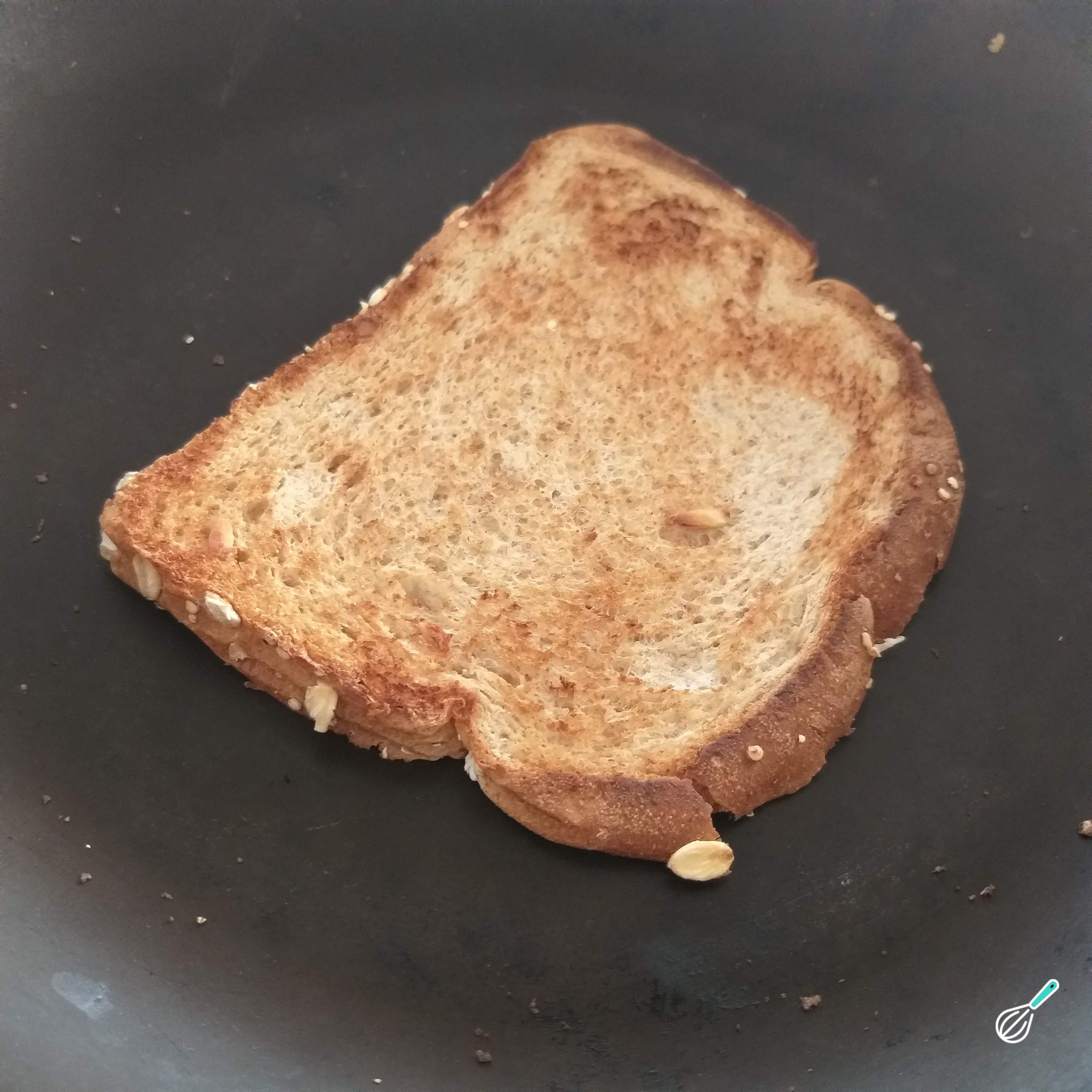 Coloque um pouco de azeite na frigideira, leve ao fogo médio e acrescente o pão. Doure dos 2 lados e reserve.