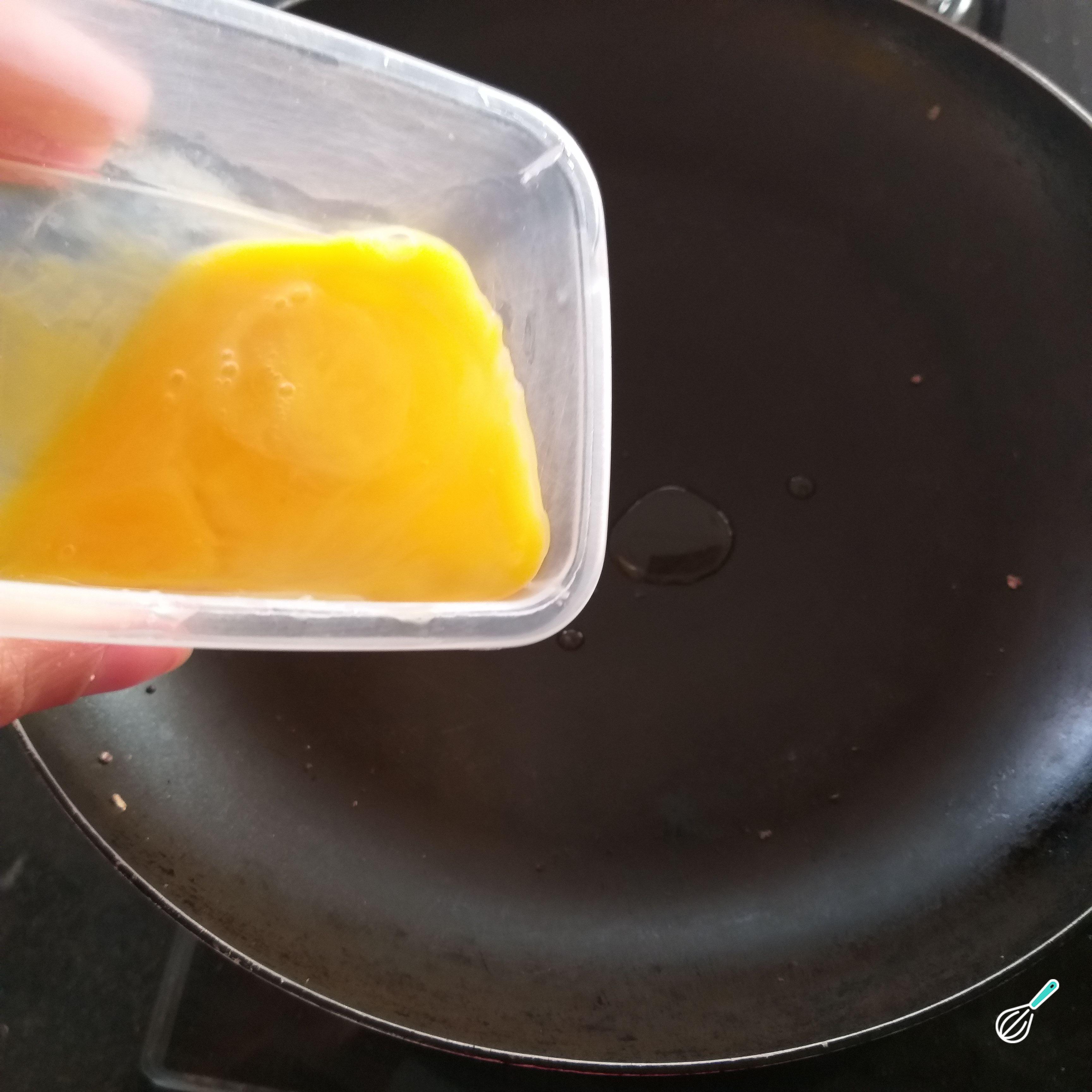 Acrescente mais um fio de azeite na mesma frigideira, coloque o ovo ligeiramente batido e tempere com uma pitada de sal.