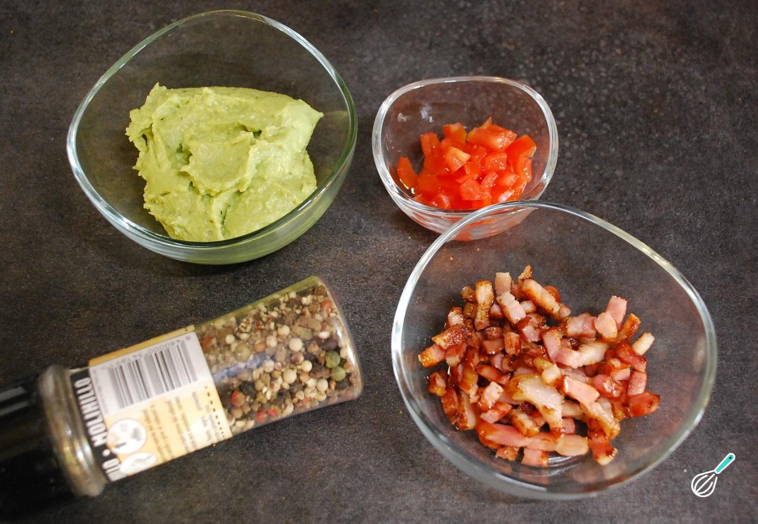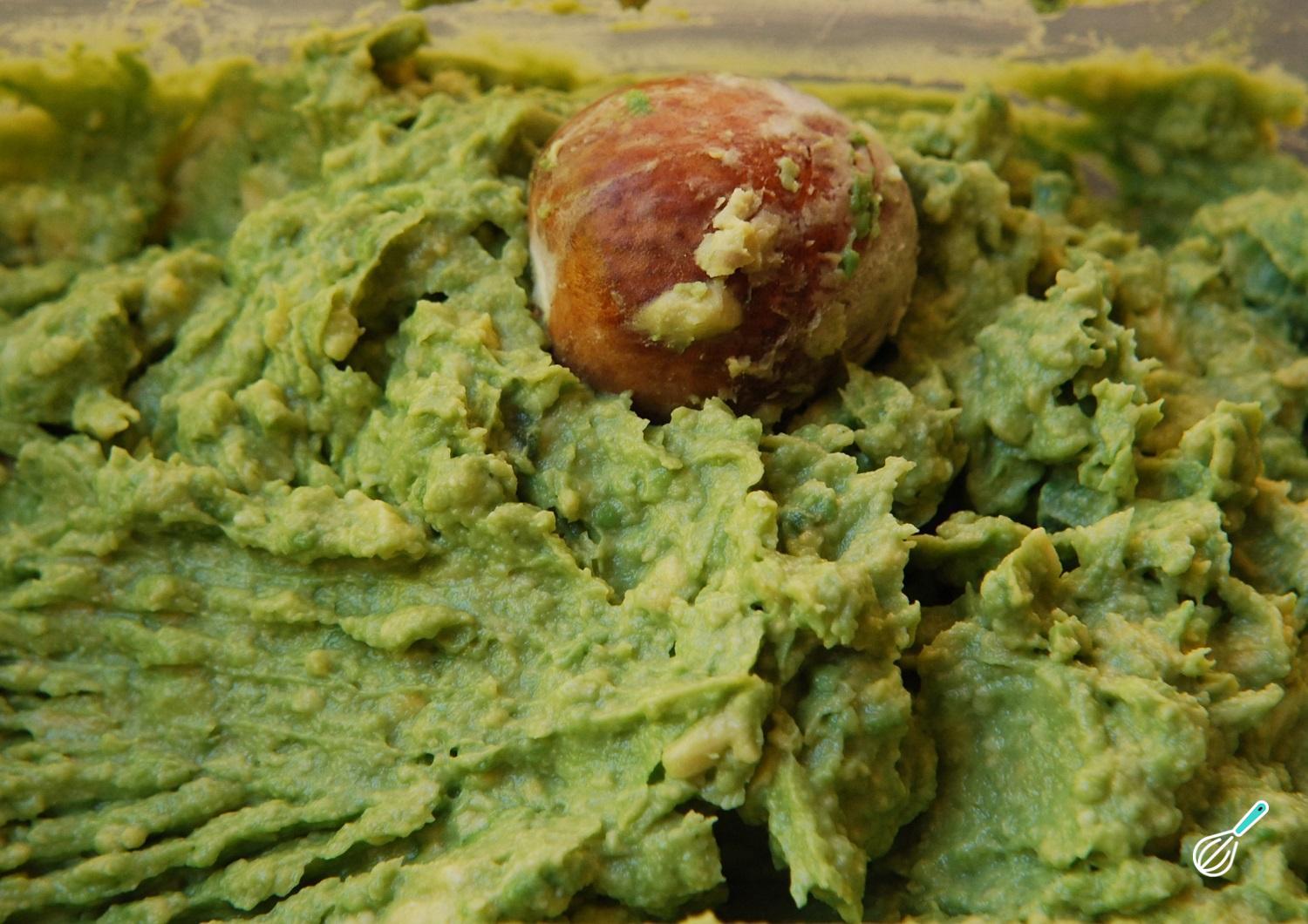 Comece por fazer a pasta de guacamole: descasque o abacate e amasse a polpa com um garfo. Depois misture nela um pouco de salsinha picada, sal, suco de limão e, se quiser, algumas gotas de molho de pimenta Tabasco também.