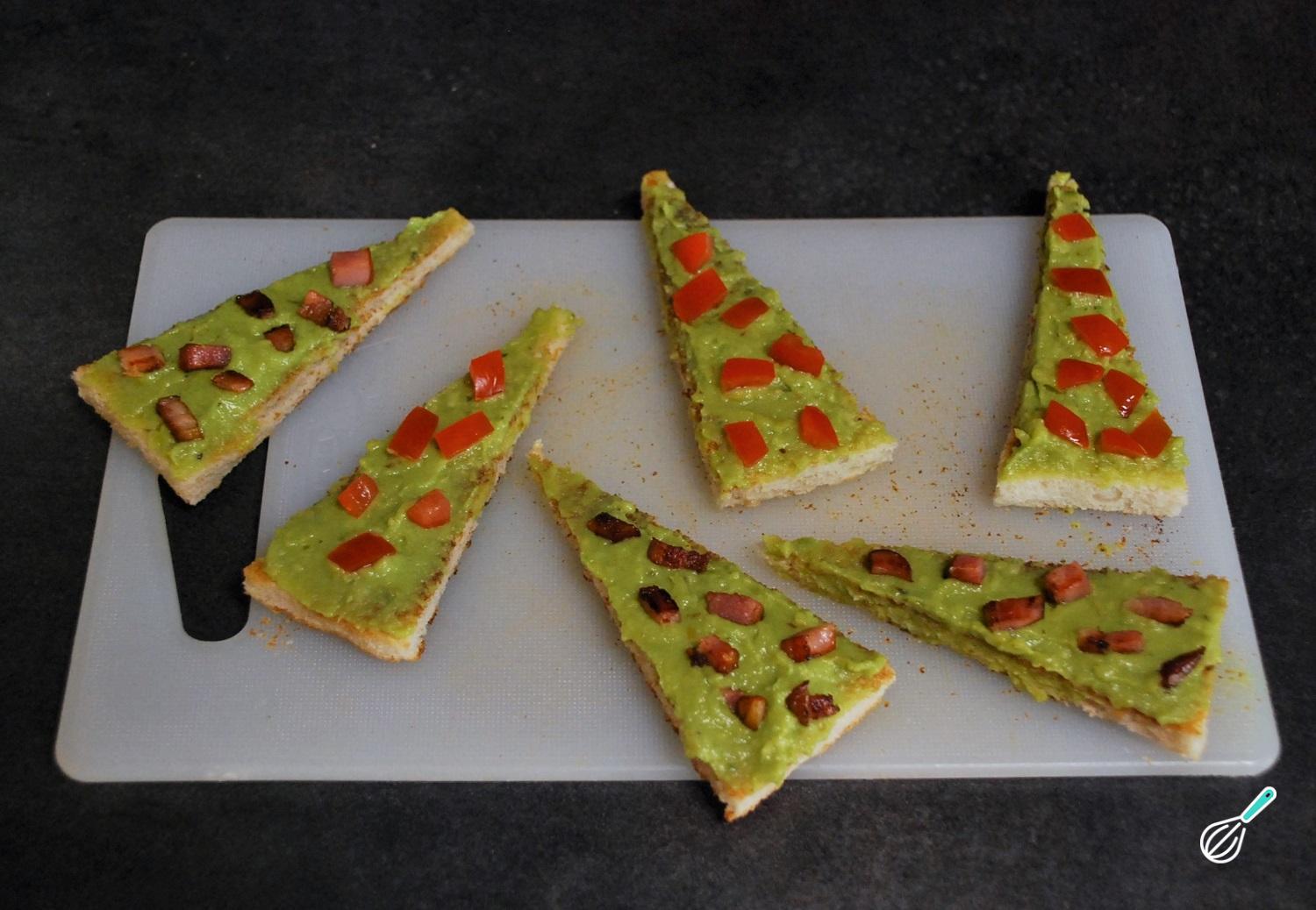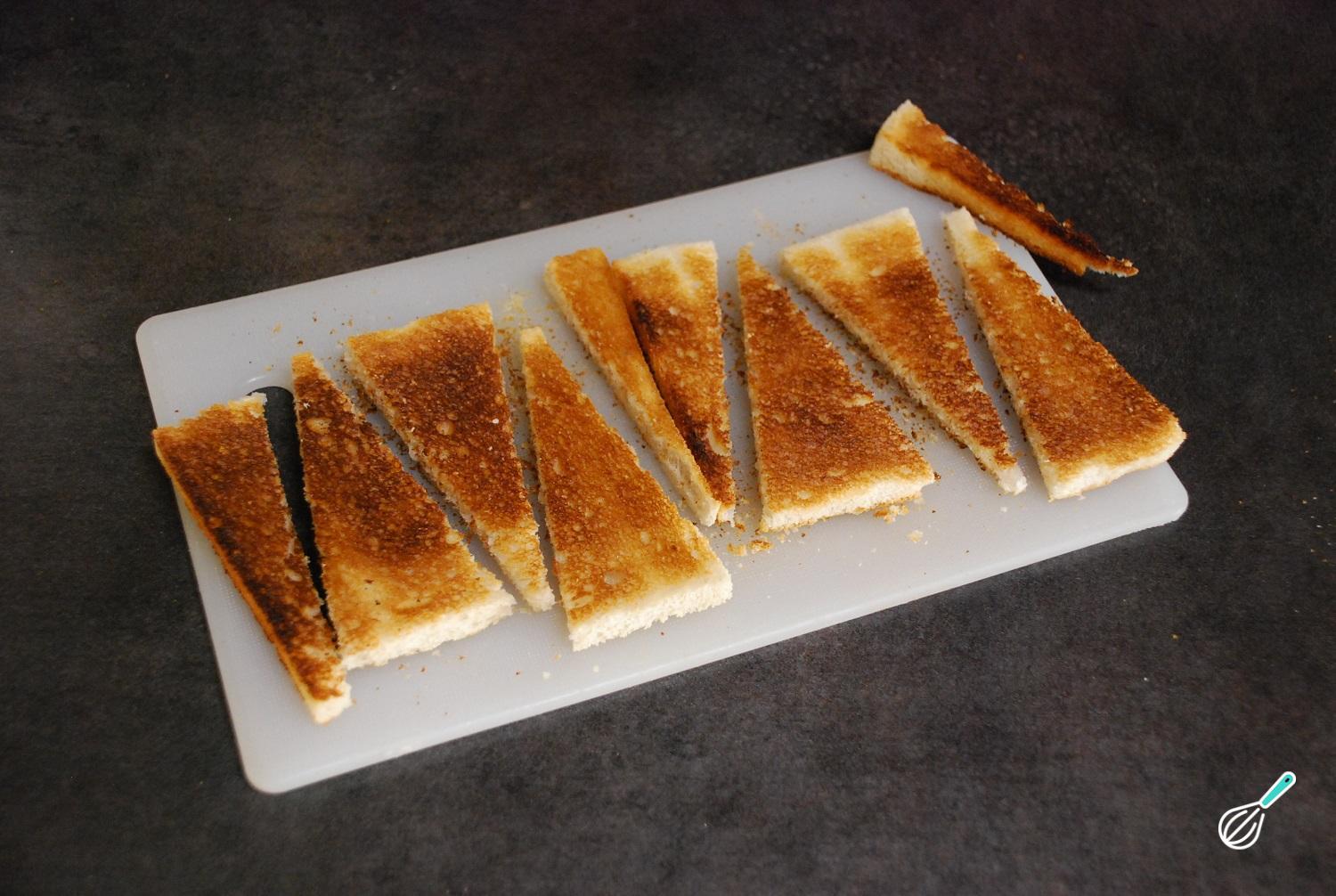 O passo seguinte desta entrada para a ceia de Natal é torrar as fatias de pão e cortar em triângulos longos, como na fotografia. Assim ficarão semelhantes a árvores de Natal.