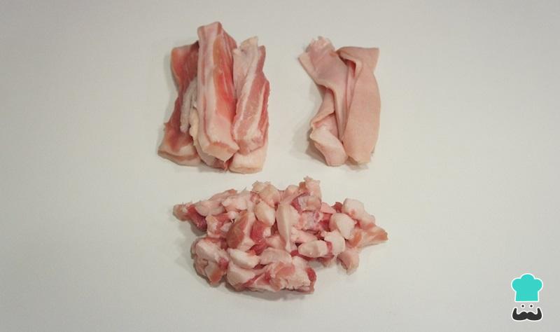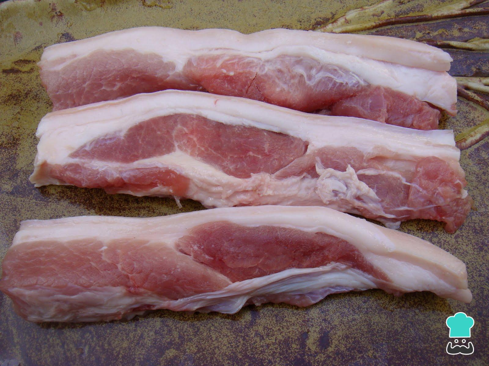 Para fazer torresmos caseiros o primeiro passo é cortar a barriga do porco em tiras com 1-2 cm de espessura. Se usar cortar fora a carne, conseguirá torresmos mais crocantes e leves.