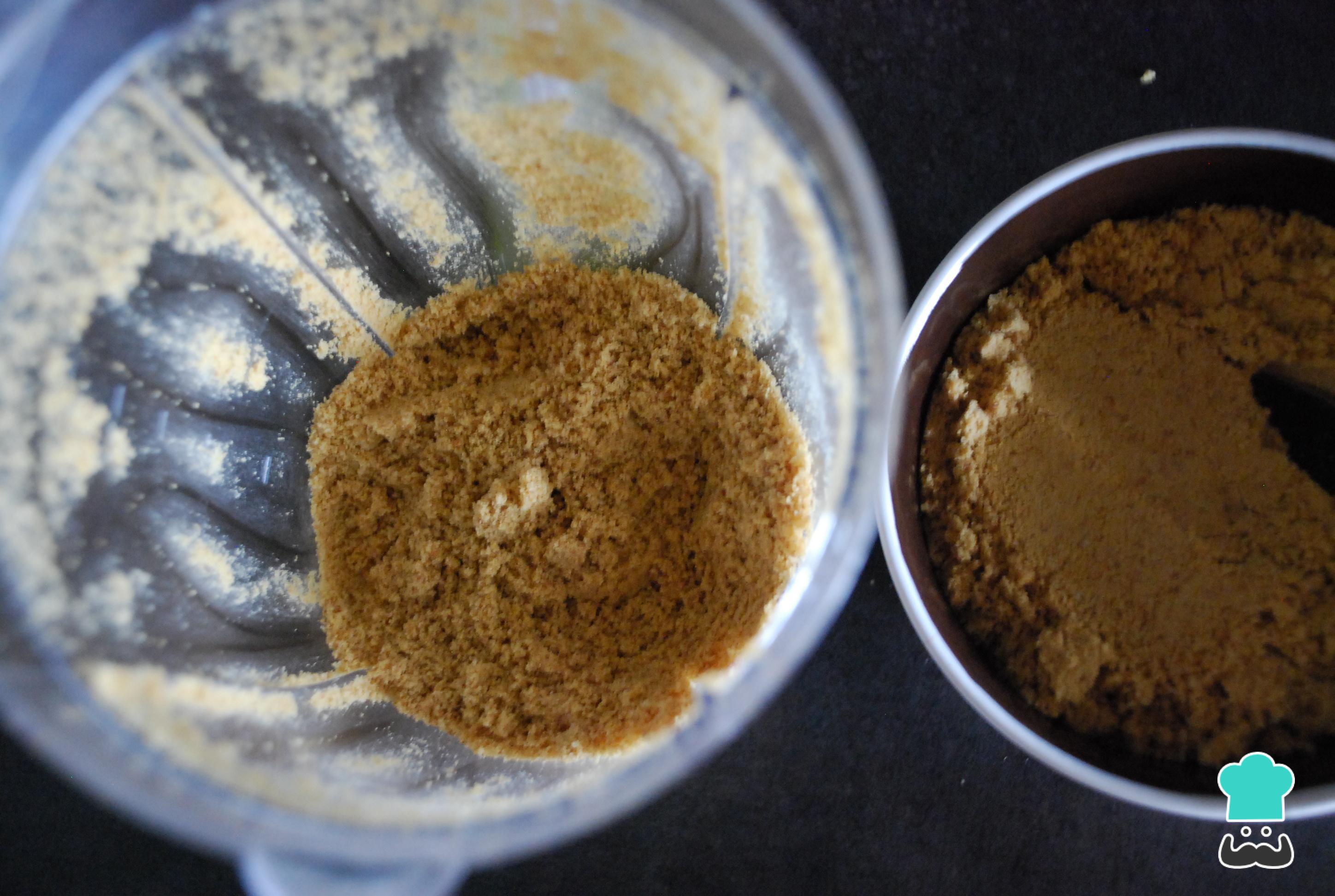 Para fazer a base da torta comece por triturar os biscoitos no liquidificador ou em um processador, até que fiquem em pó.