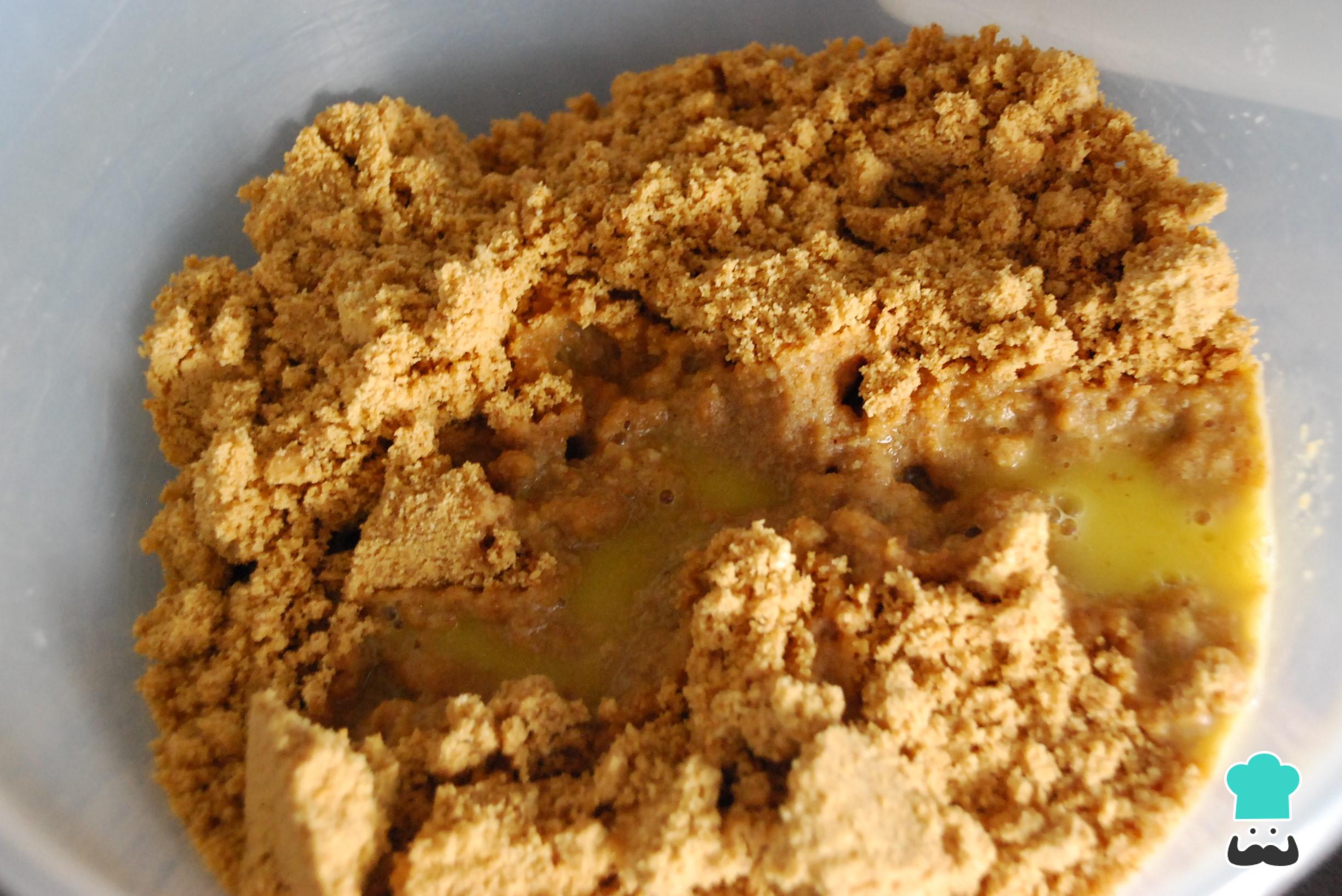 Em seguida misture os biscoitos em pó com a manteiga derretida, amassando bem as com as mãos para obter uma massa homogênea e compacta.