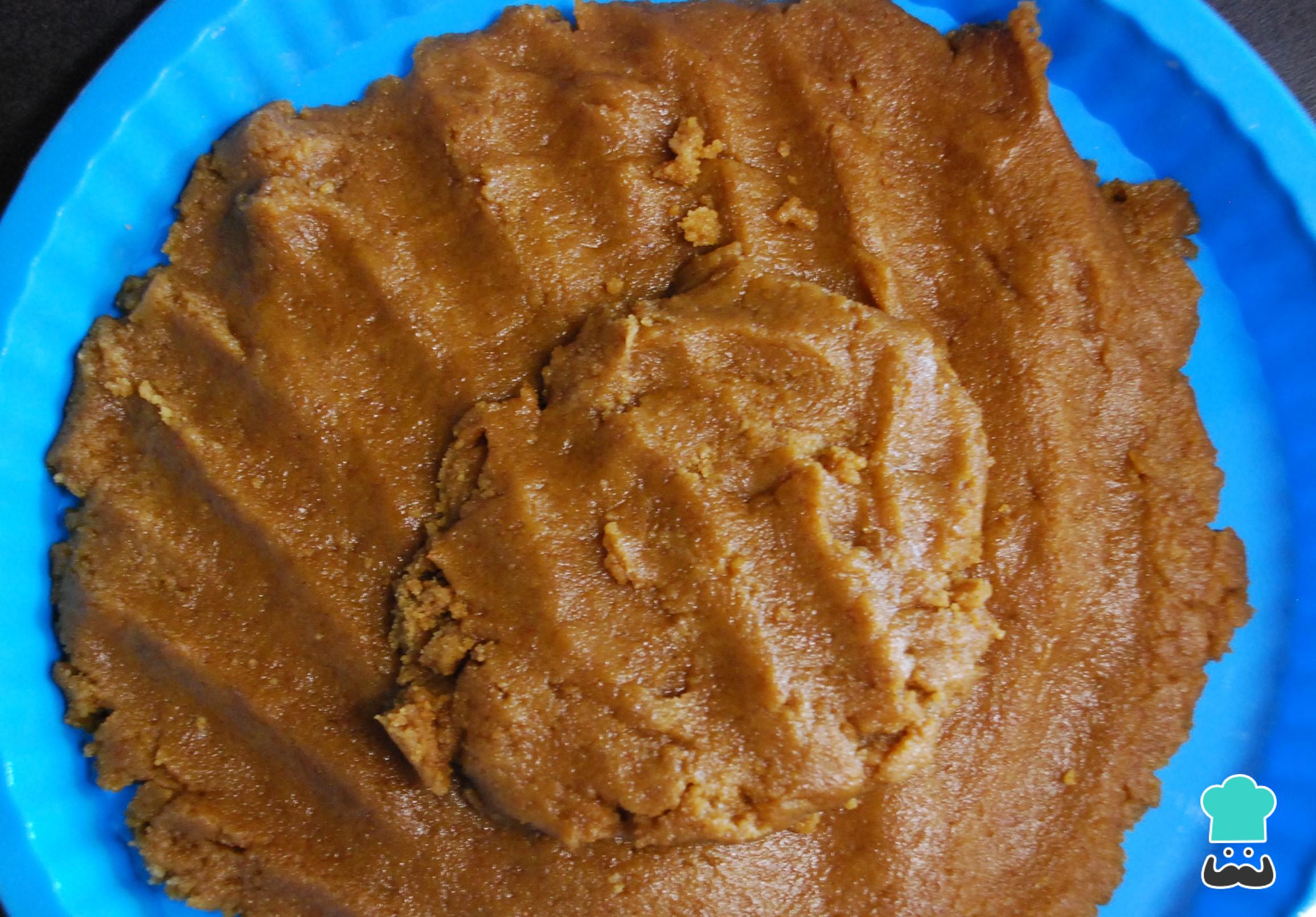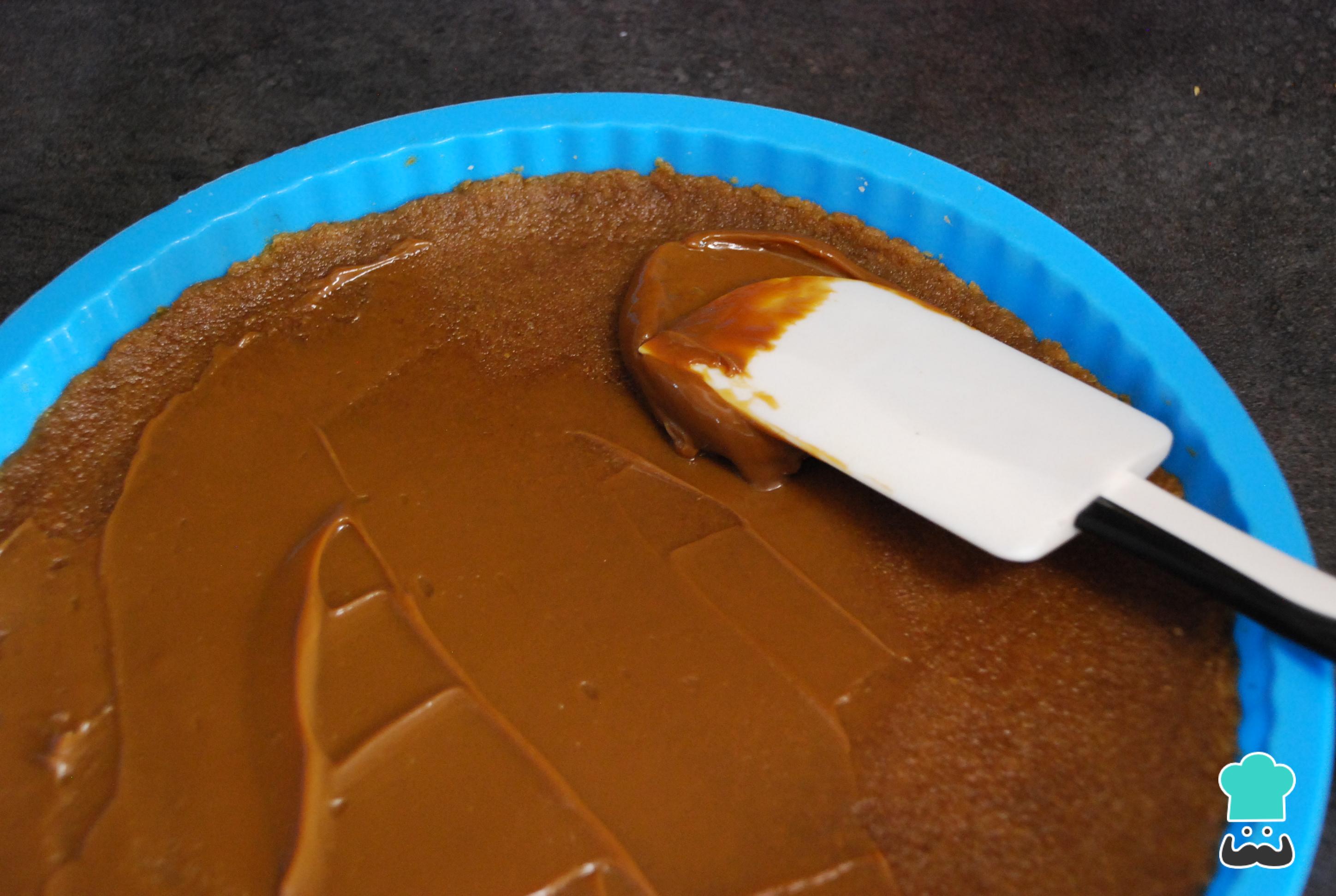 O passo seguinte desta receita de banoffee é espalhar a massa anterior numa forma de torta, deixando-a o mais uniforme possível.