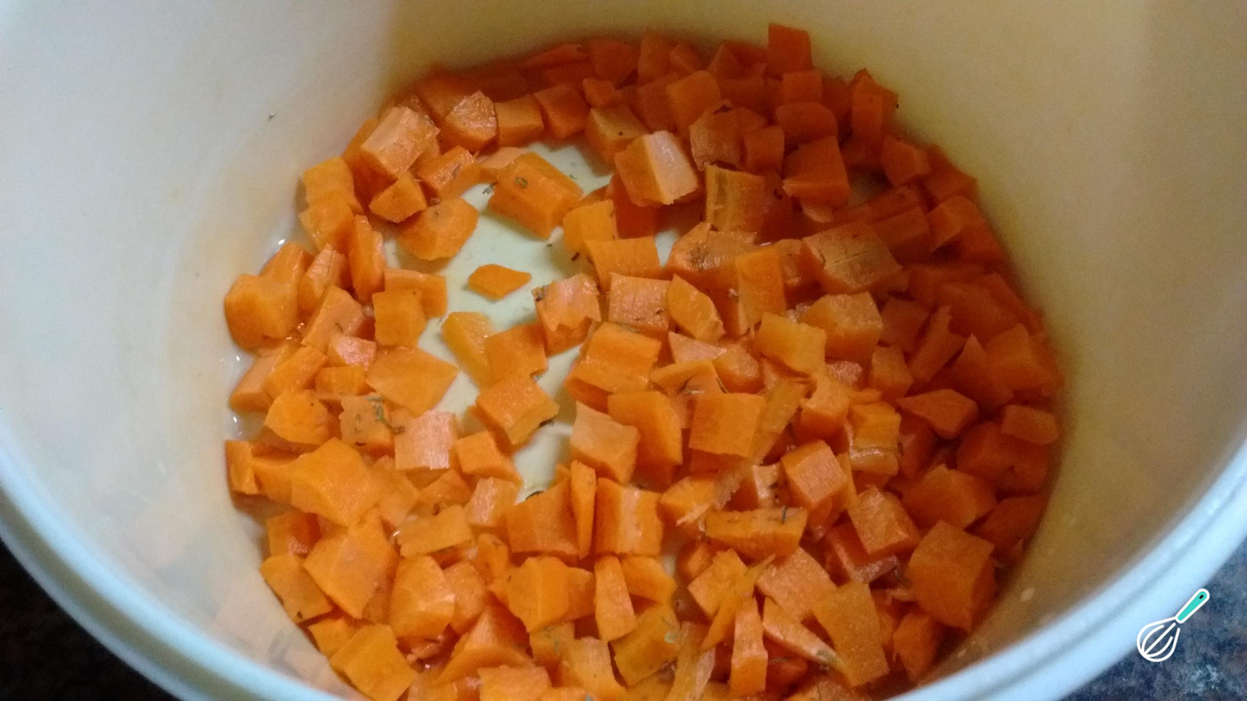 Para o recheio da sua torta, descasque e corte a cenoura em cubos pequenos. Leve para um recipiente próprio para micro-ondas e cozinhe com 2 colheres de sopa de água e o tomilho por cerca de 3 minutos.