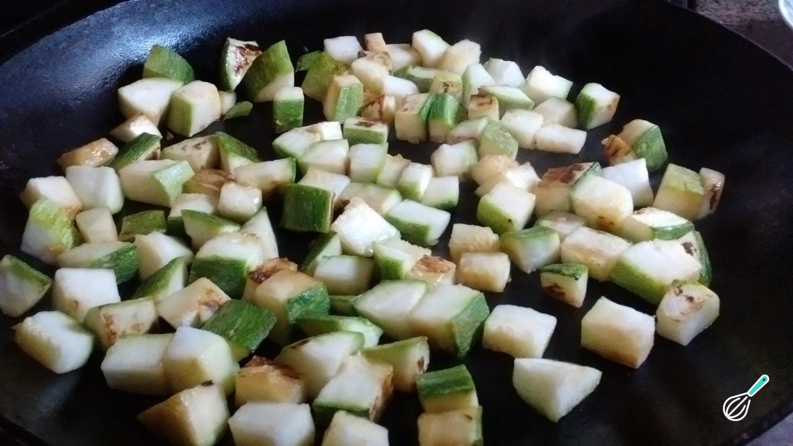 Enquanto isso, lave e corte a abobrinha em cubos pequenos. Refogue-os em fogo alto com 1 colher de sopa de óleo sem mexer até que comecem a dourar. Repita até que todos os lados estejam dourados.
