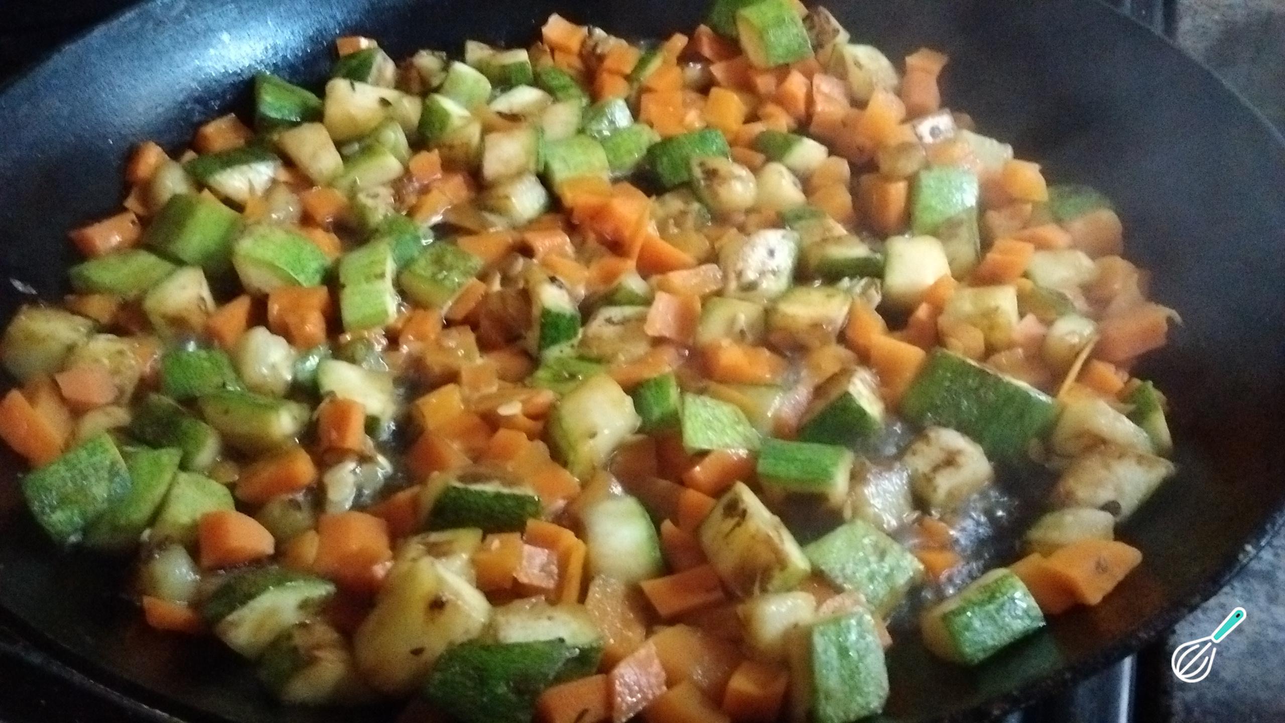 Quando as abobrinhas estiverem bem douradas, acrescente a cenoura que você cozinhou anteriormente no micro-ondas. Quando o refogado estiver bem aquecido, acrescente o vinho branco e espere o cheiro passar de acido para doce devido ao álcool.
