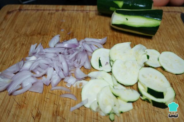 Comece por preparar os legumes: descasque e pique a cebola em pedaços, lave as abobrinhas e pique em pedaços também ou corte em rodelas finas.