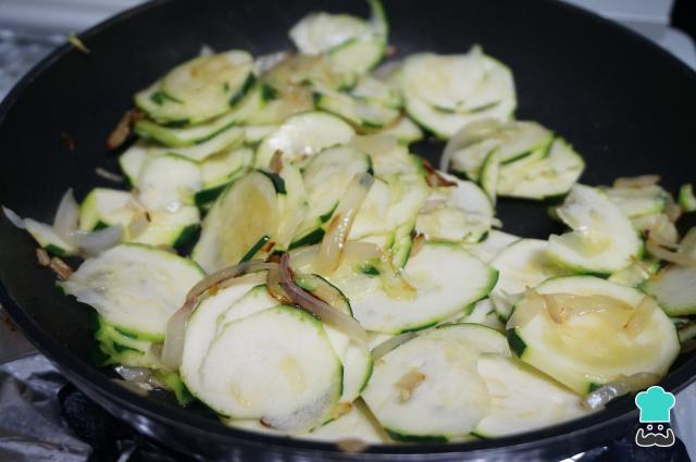 Leve ao fogo uma frigideira ou panela com o azeite e refogue a cebola e a abobrinha por 5 minutos, em fogo médio-baixo, até que fiquem macias. Tempere com sal e pimenta do reino.