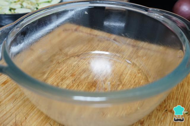 Unte com manteiga ou azeite um recipiente que possa ir no microondas. Neste caso usei uma vasilha de vidro com, aproximadamente, 22 cm de diâmetro.