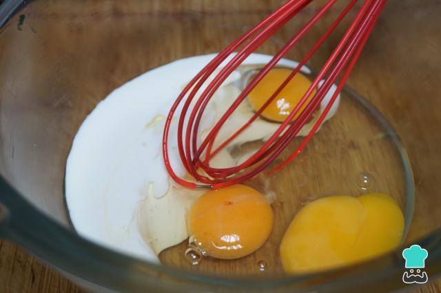 Coloque na vasilha os ovos e o creme de leite e bata até misturar bem e espumar. Tempere com sal e pimenta do reino.