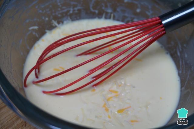 Adicione o queijo e bata até incorporar. Pode usar qualquer queijo da sua preferência, mas eu aconselho usar queijo que derreta facilmente, como mussarela, parmesão, cheddar, entre outros.