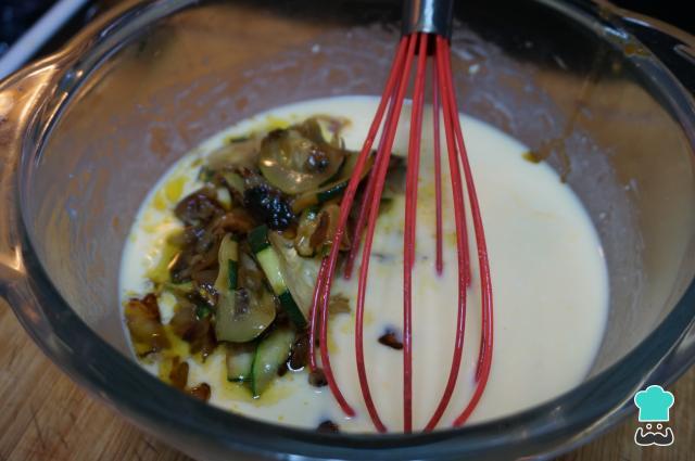 Adicione a cebola e abobrinha refogadas, junto com o azeite da frigideira, e misture.