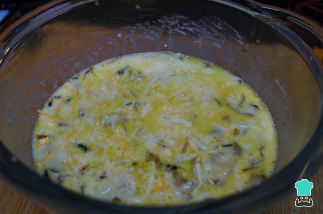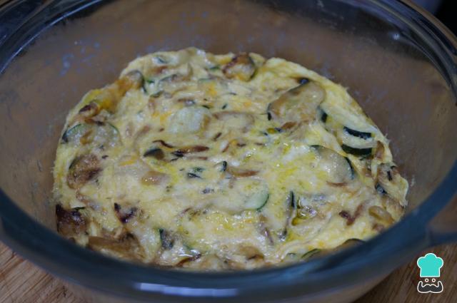 Por fim, polvilhe esta mistura da torta de ovo de abobrinha com um pouco de queijo, para gratinar. Leve ao microondas nos 950 W ou em potência média-alta, durante 6 minutos.