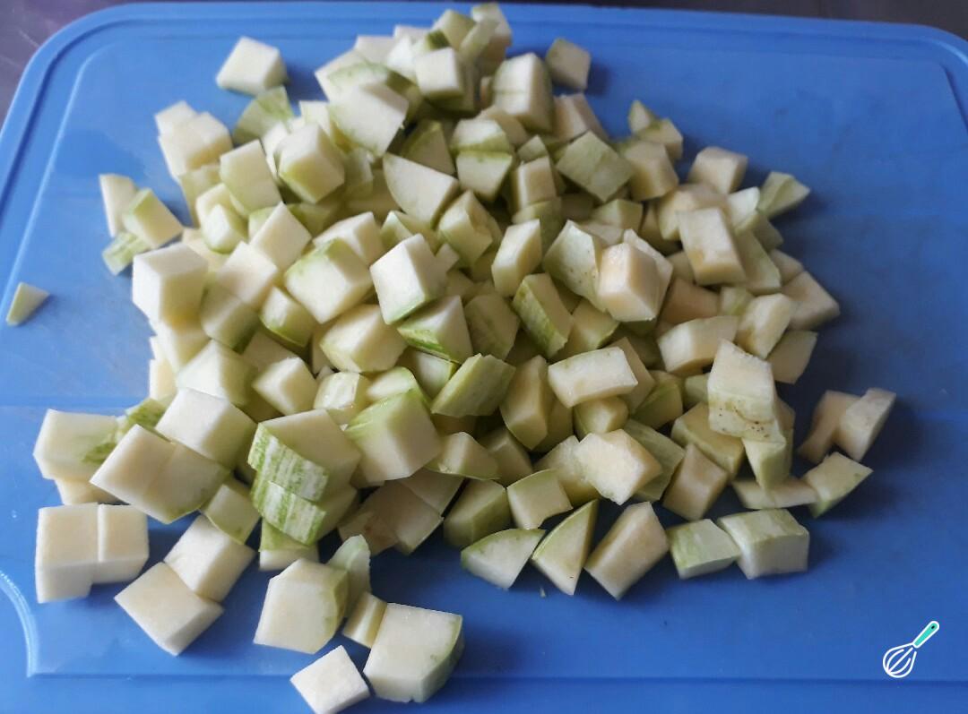 Comece por lavar a abobrinha, retirar as sementes da abobrinha e cortar em cubos pequenos.