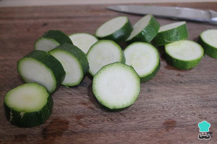 Primeiramente lave a abobrinha e seque. Corte fora as pontas e fatie uma das abobrinhas em rodelas com cerca de 1 cm de espessura.