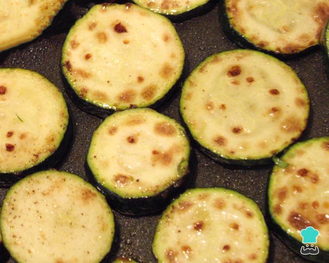 Leve ao fogo alto uma frigideira com 1 colher de sopa de azeite de oliva e doure as abobrinhas de ambos os lados. Retire para um prato com papel absorvente, para eliminar o excesso de gordura. Reserve a frigideira com o azeite nela.