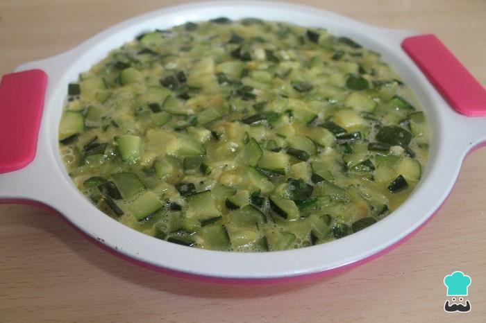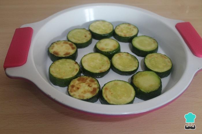 Num bowl bata os ovos com um pouco de sal e coloque a abobrinha refogada. Misture e verta na assadeira, cuidando para não mover as rodelas de abobrinha. Asse no forno a 180ºC, com calor em cima e em baixo, durante 15-20 minutos.