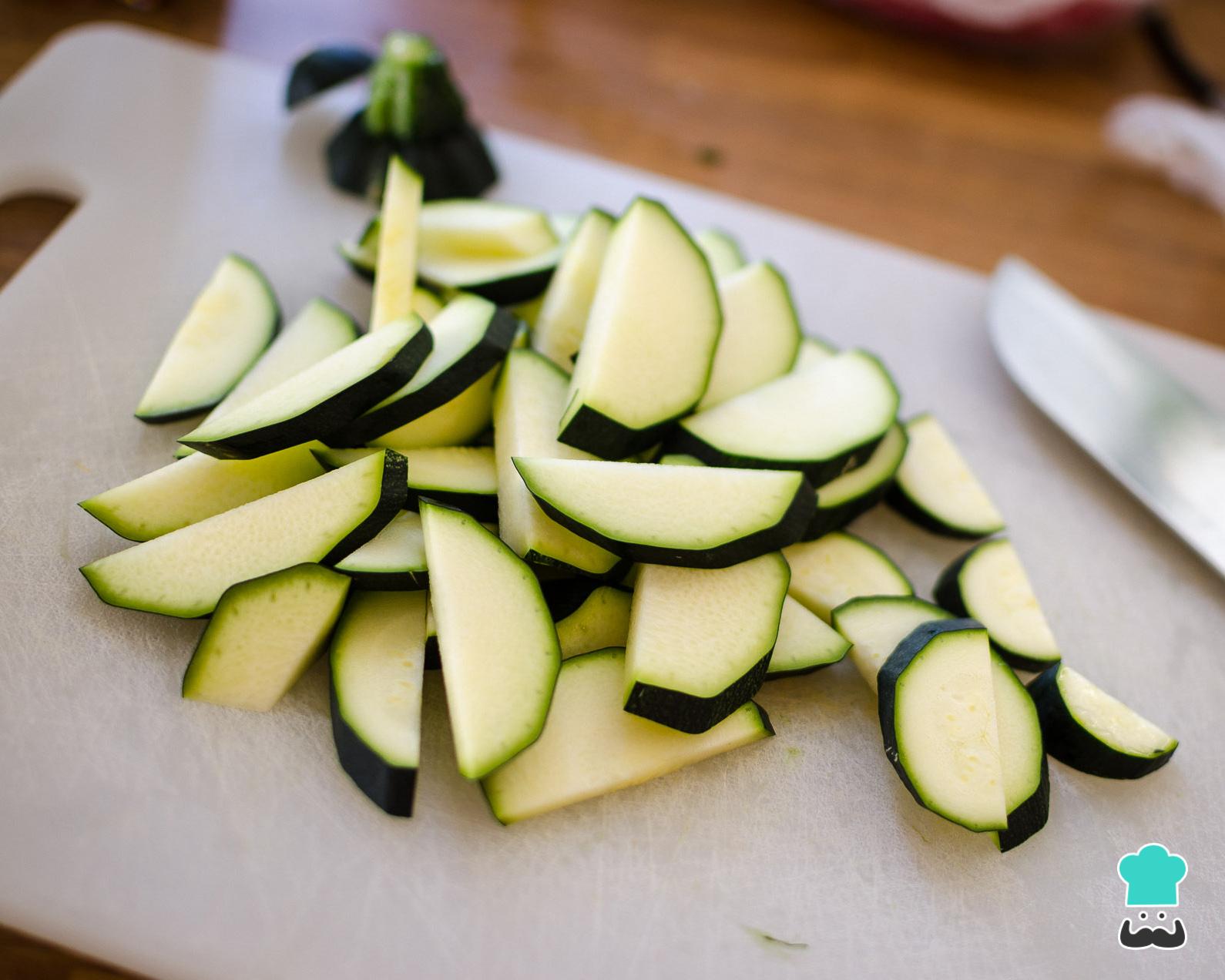 Comece por picar a abobrinha, a cebola e o tomate em pedaços (não precisam ser muito finos, pois eles serão batidos no liquidificador).