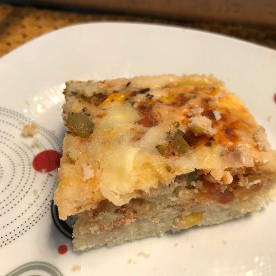 Fiz a receita de torta com farinha de arroz, mas com recheio de atum, tomate, queijo, milho verde e azeitona. Salpiquei queijo por cima. Ficou uma delícia! A massa é leve e saborosa.