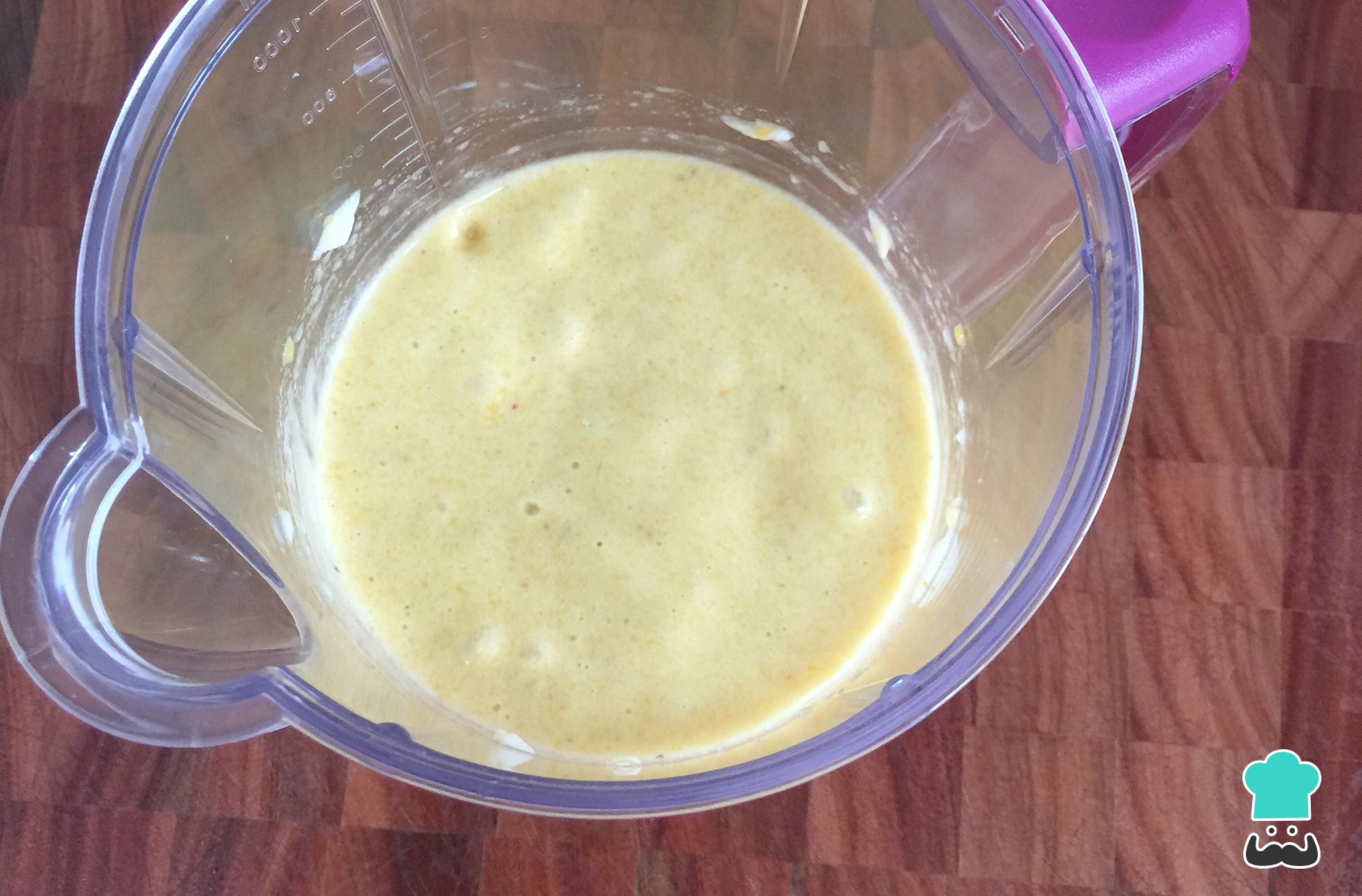 Comece por preparar a massa da torta de atum com farinha de arroz: bata todos os ingredientes respetivos (com exceção do fermento) no liquidificador, até ficar sem grumos pouco consistente.