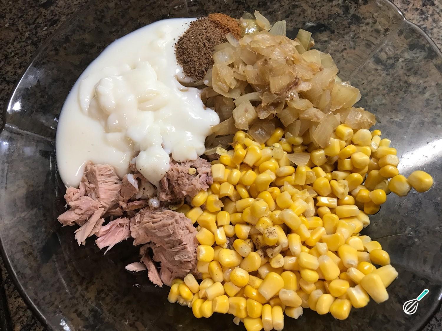Para fazer o recheio, misture o atum com o milho, a cebola, o molho branco e tempere a gosto.
