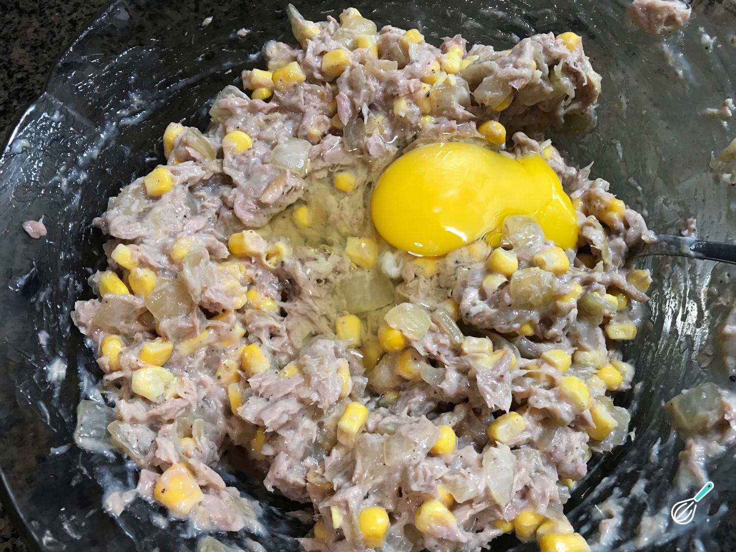 Depois de experimentar e gostar do tempero da sua torta de atum fit, acrescente o ovo e integre. Neste ponto, pré-aqueça o forno a 200ºC.