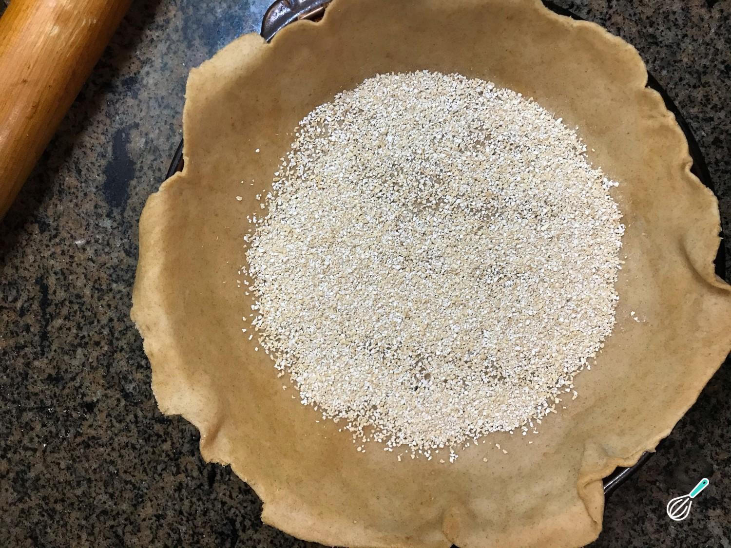 Forre a forma com a massa e cubra o fundo com aveia, farinha de rosca ou fubá. Isso absorverá a umidade do recheio e deixará a base crocante.